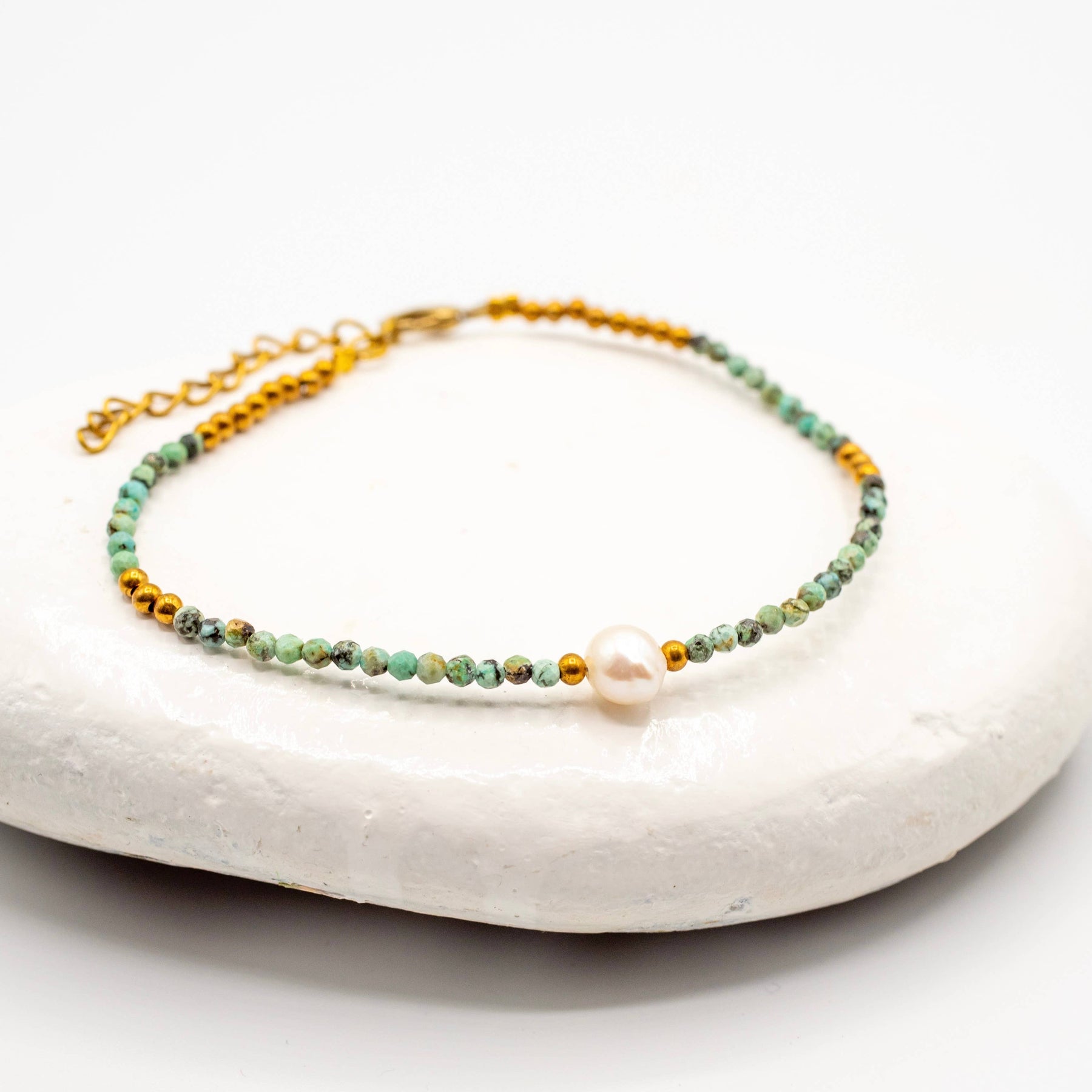 Beaded bracelet featuring African turquoise and natural pearl on adjustable closure clasp.