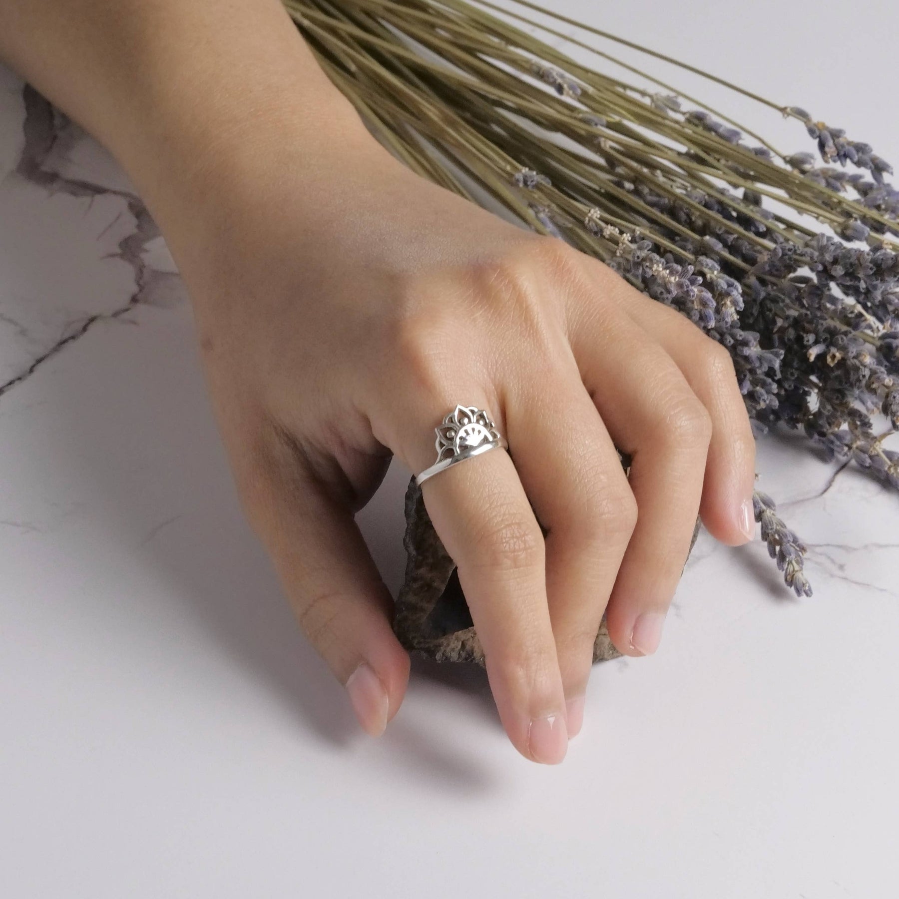 Sterling silver lotus design ring.