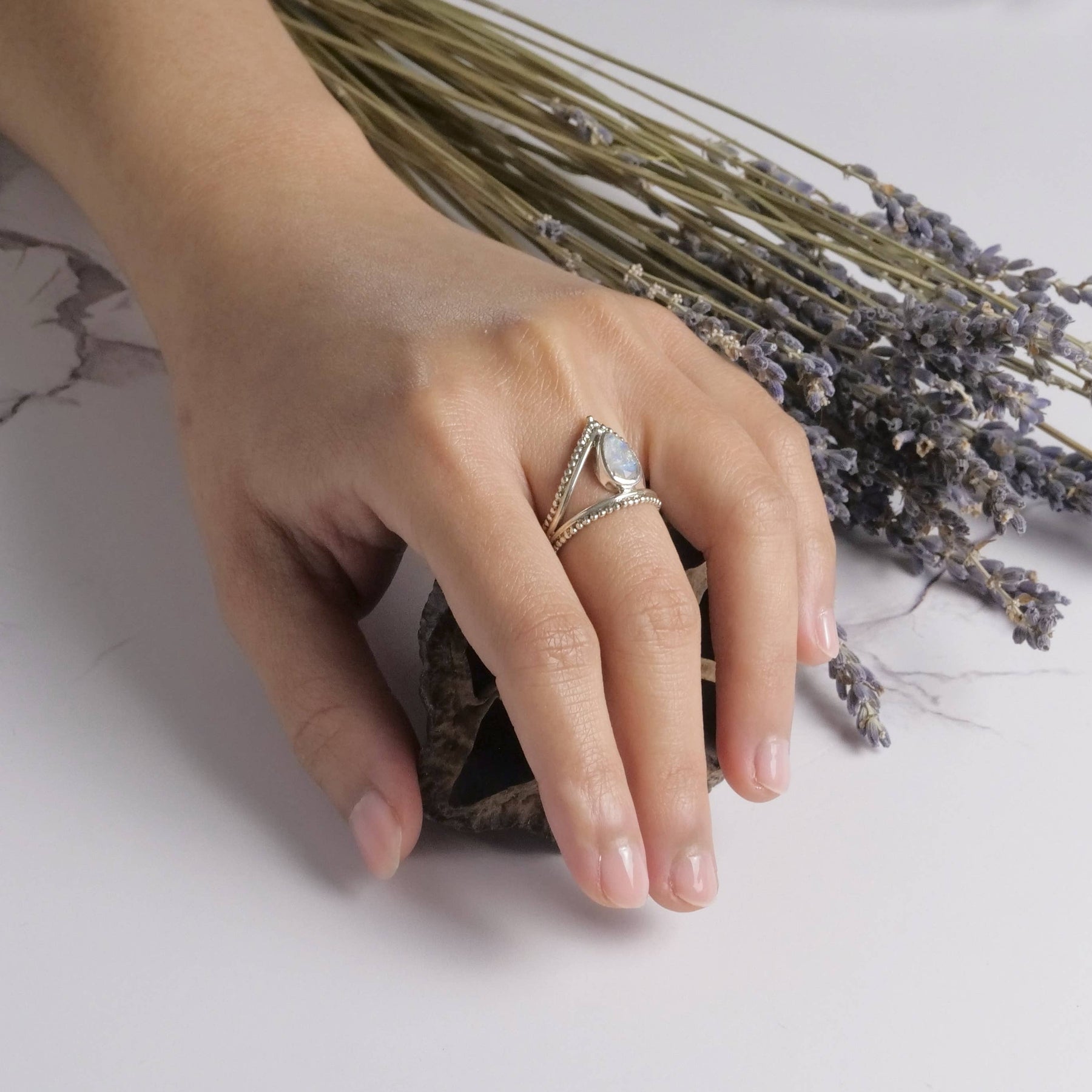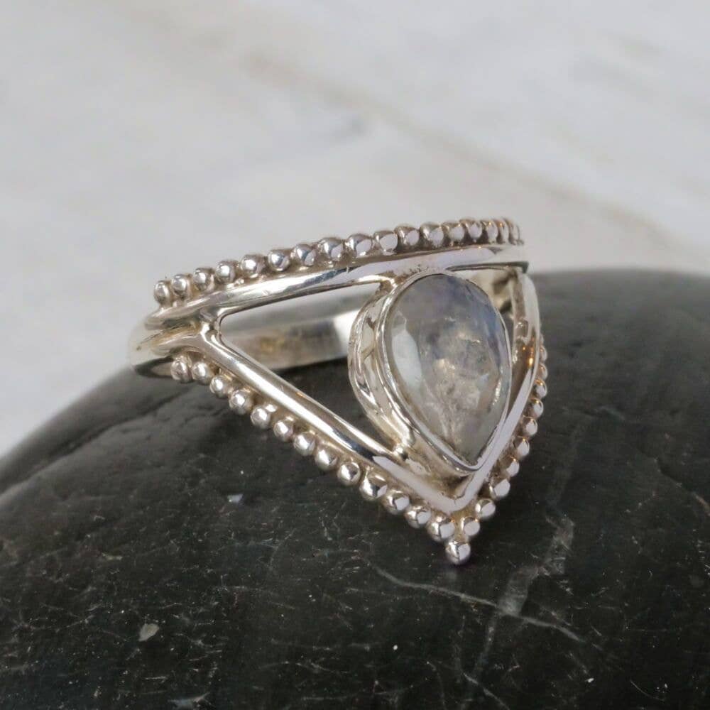Sterling silver spotted triangle ring with faceted Moonstone.