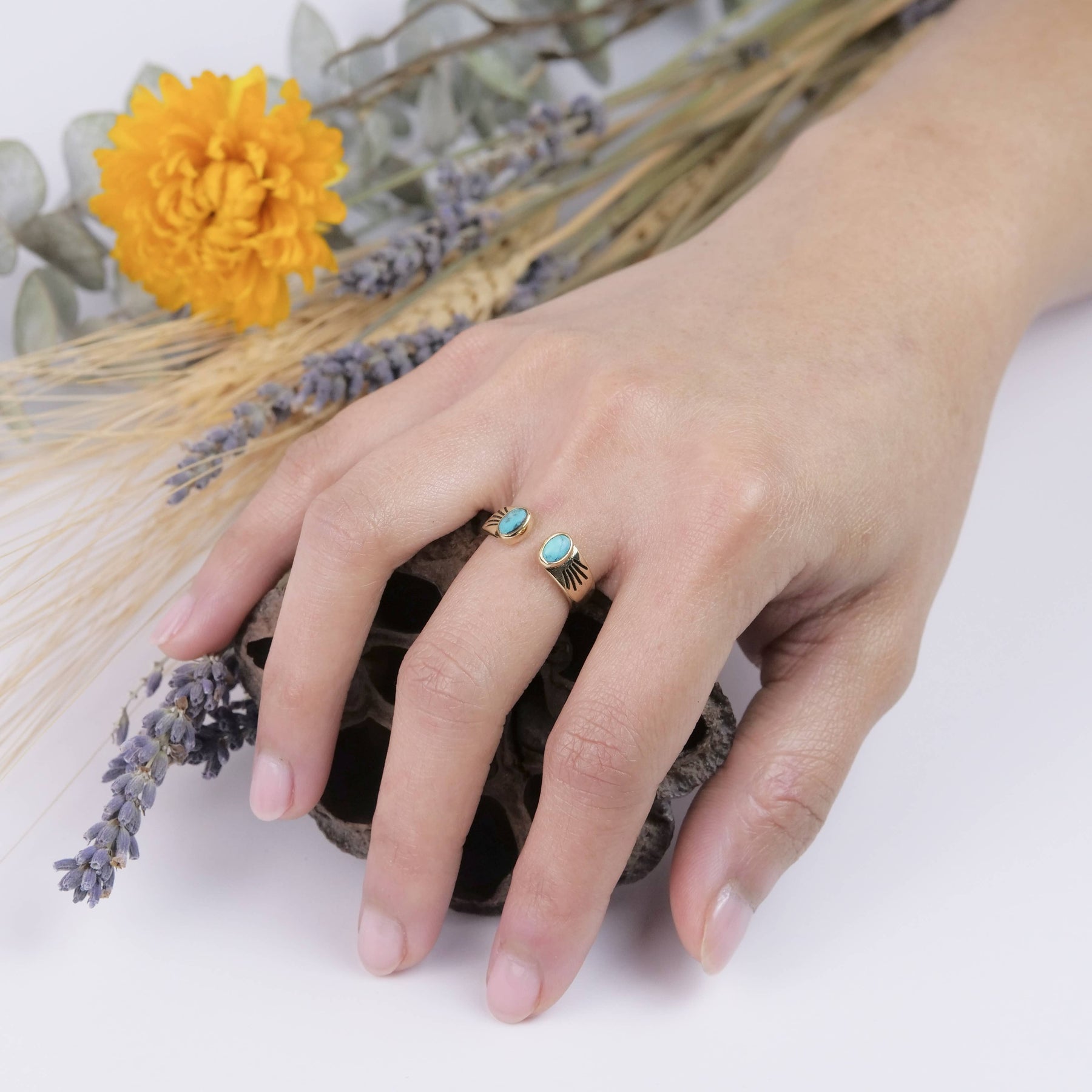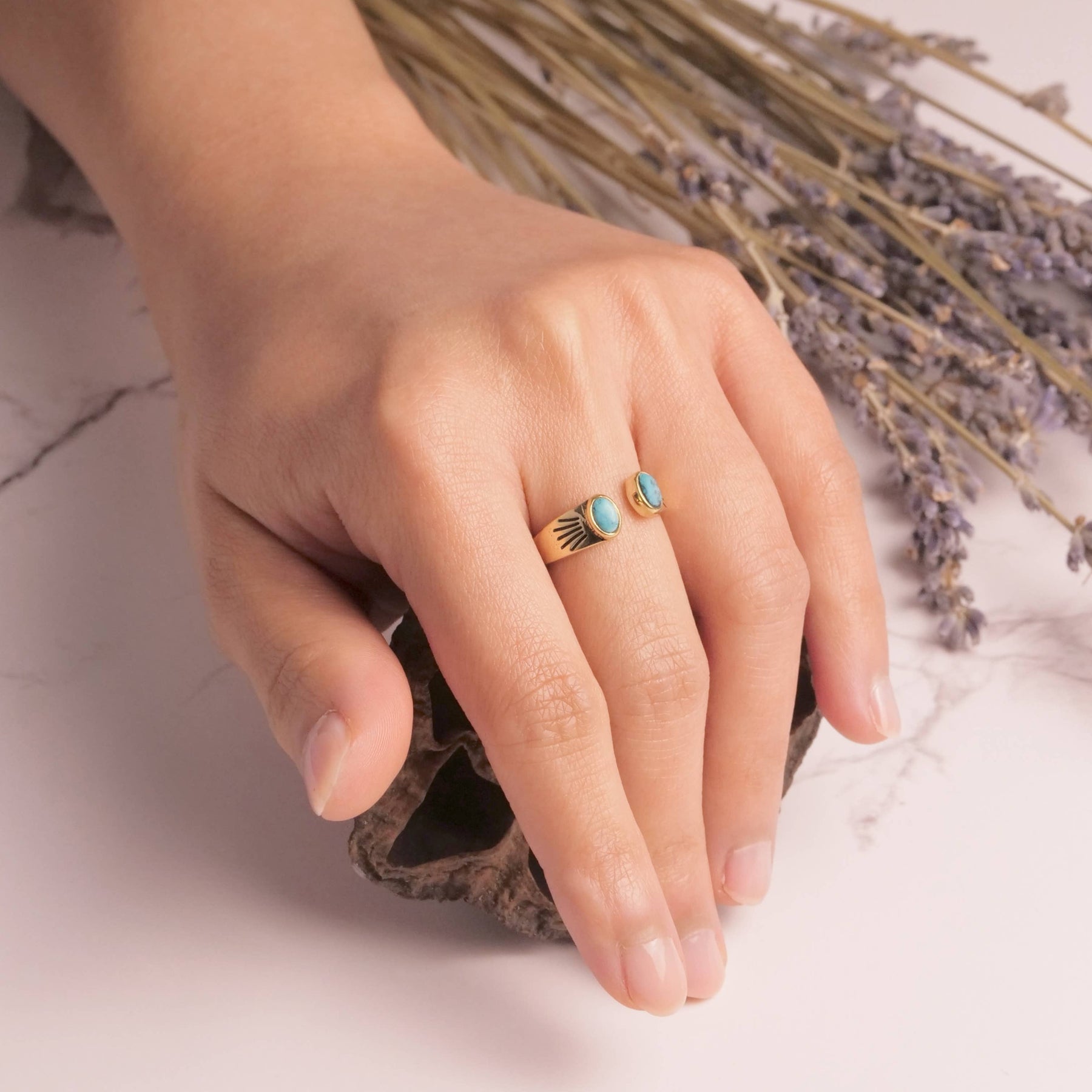 Brass ring featuring open design, dreamy turquoise stone and etched ray detail. Size 6-9.