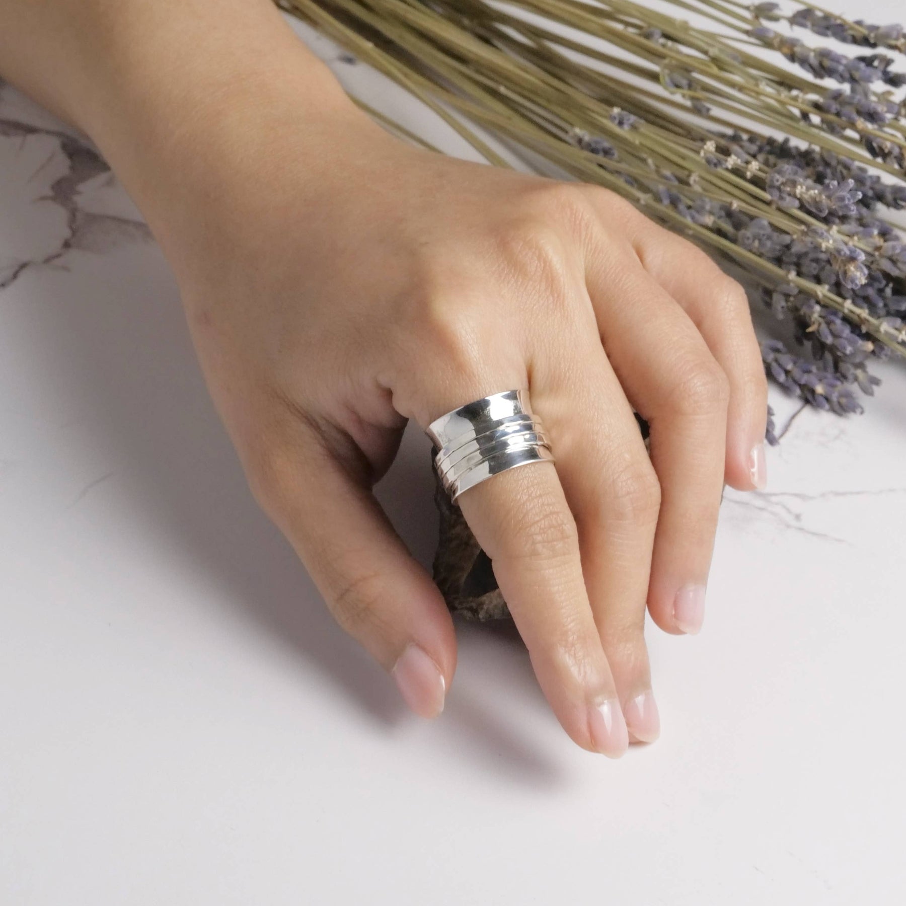 Our spinner rings are handmade with sterling silver and natural stones by silversmith artisans in Rajasthan, India. Inspired by the ancient prayer wheels of Tibet, you can spin the bands on your ring to reduce anxiety and support your own meditation practice.