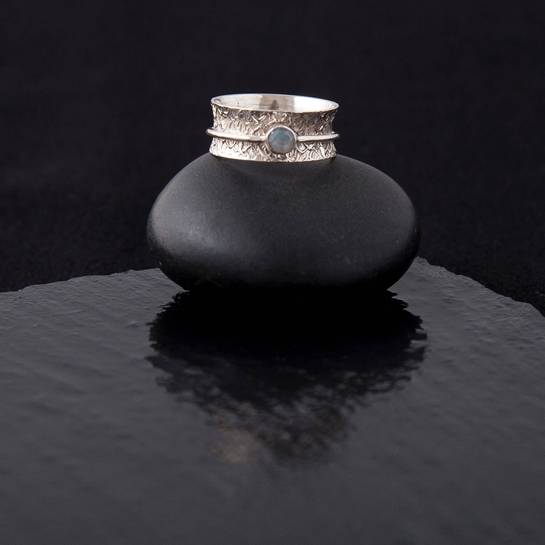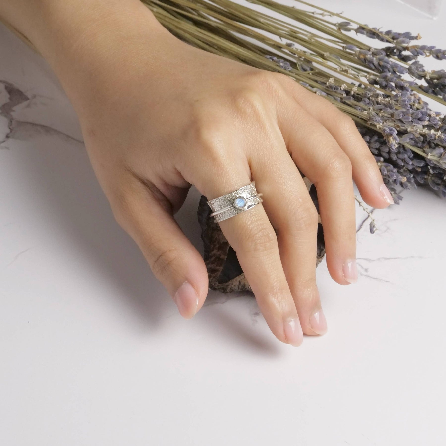 Etched sterling silver spinner ring with one band featuring a faceted moonstone.