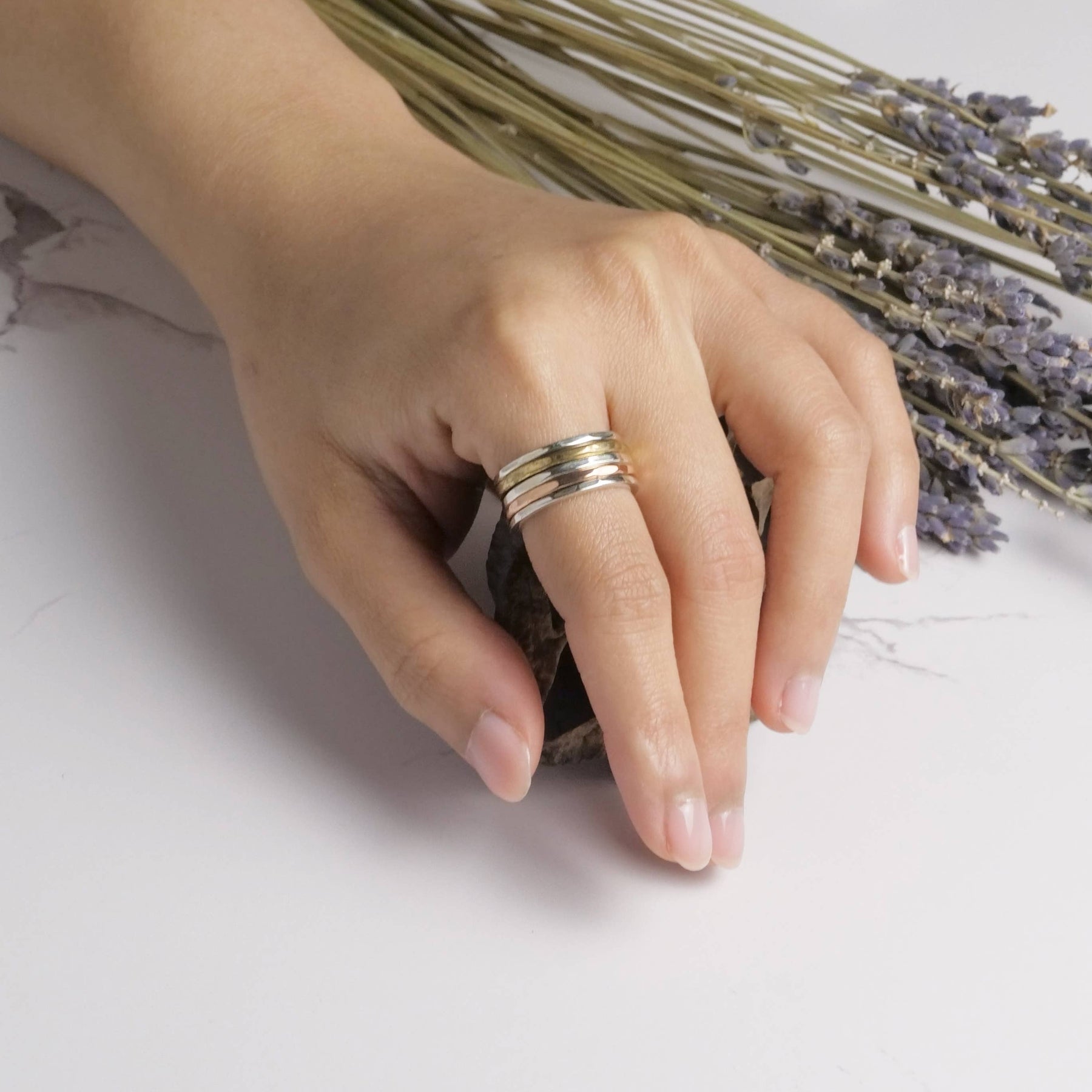 Simple sterling silver spinner ring with three hammered mixed metal bands.