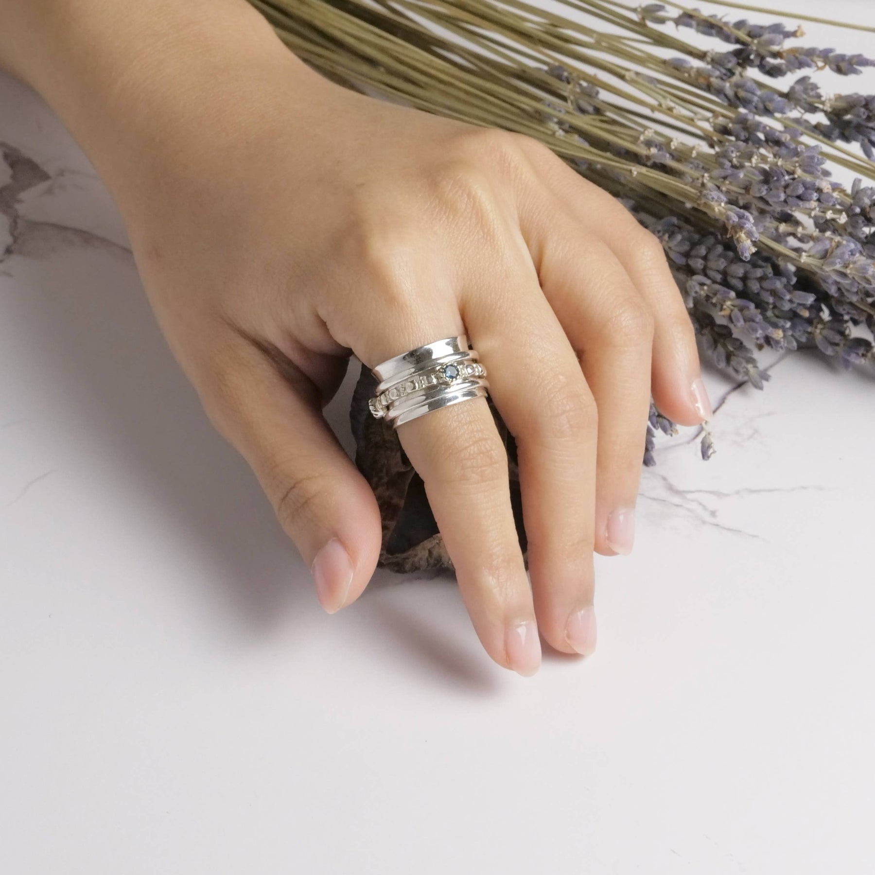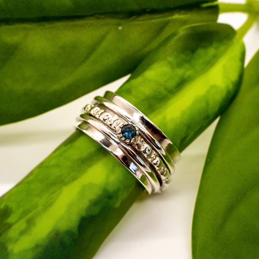 Sterling silver spinner ring with 3 bands and 3 faceted Blue Topaz stones, available in size 6-10.