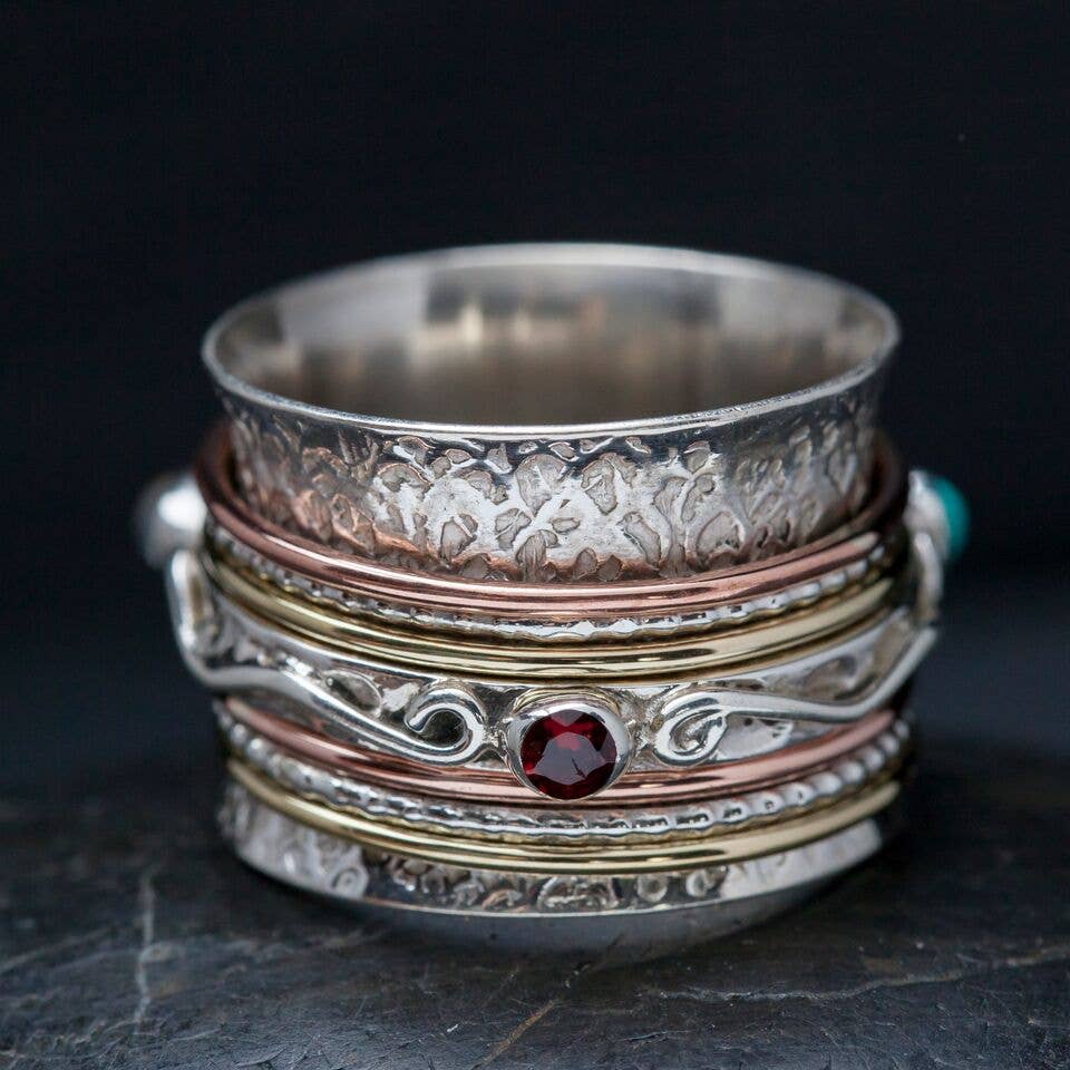 Sterling silver meditation ring featuring mixed metal bands with a decorated silver center band featuring three stones around it. Stones are cut garnet, turquoise and moonstone.