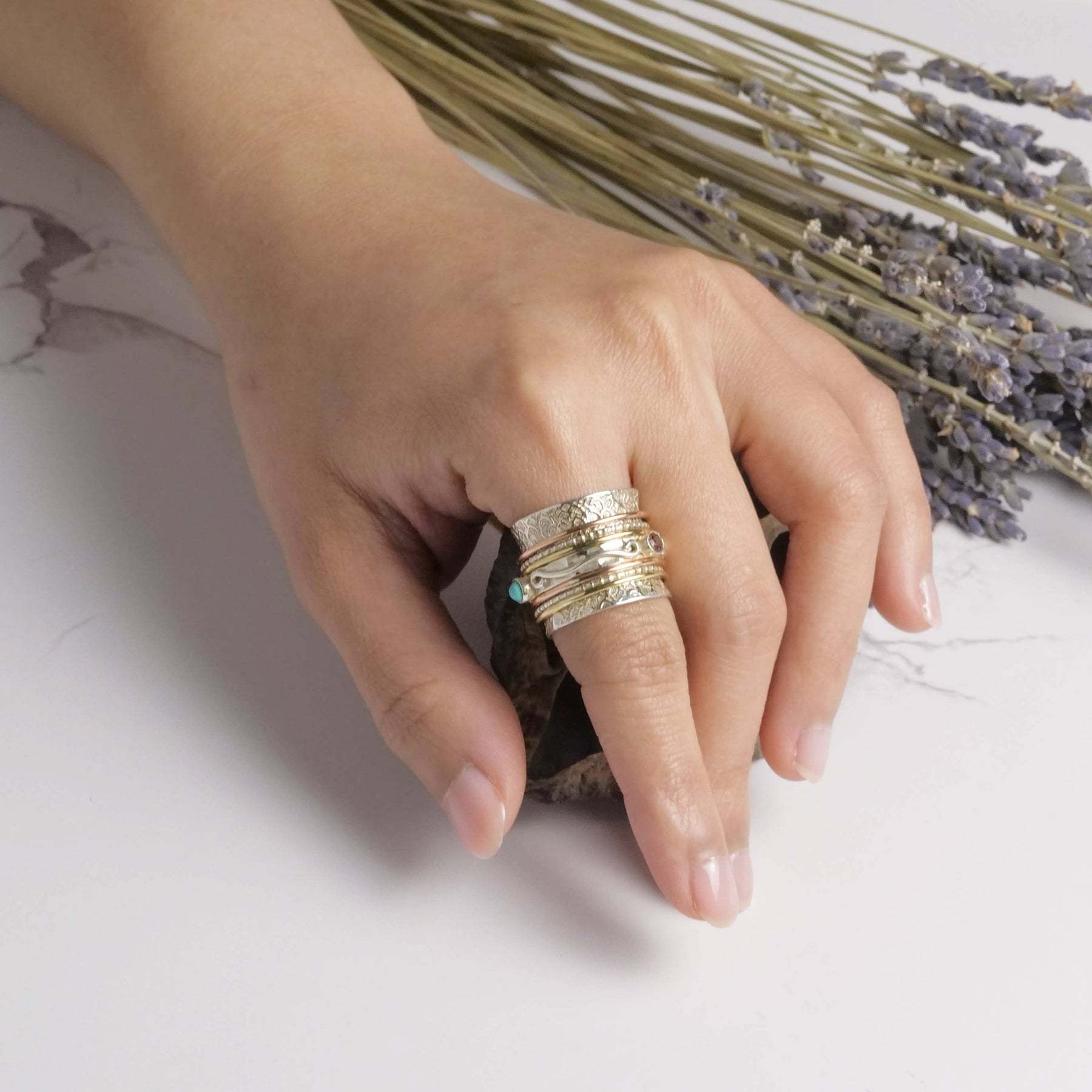 Our spinner rings are handmade with sterling silver and natural stones by silversmith artisans in Rajasthan, India. Inspired by the ancient prayer wheels of Tibet, you can spin the bands on your ring to reduce anxiety and support your own meditation practice.