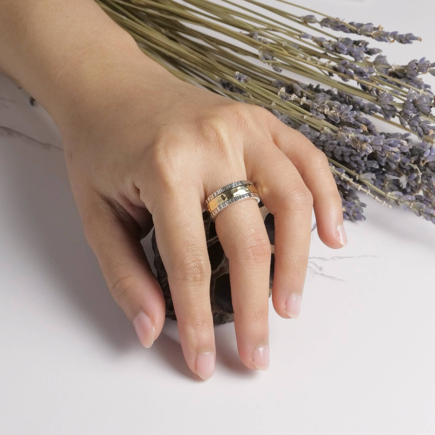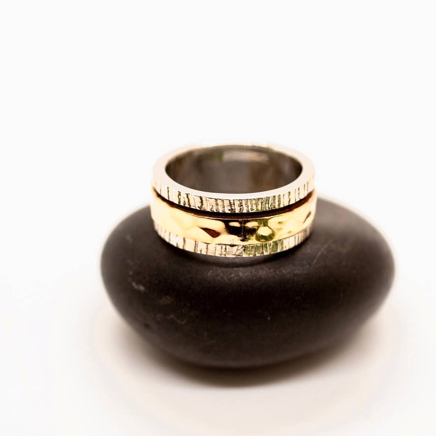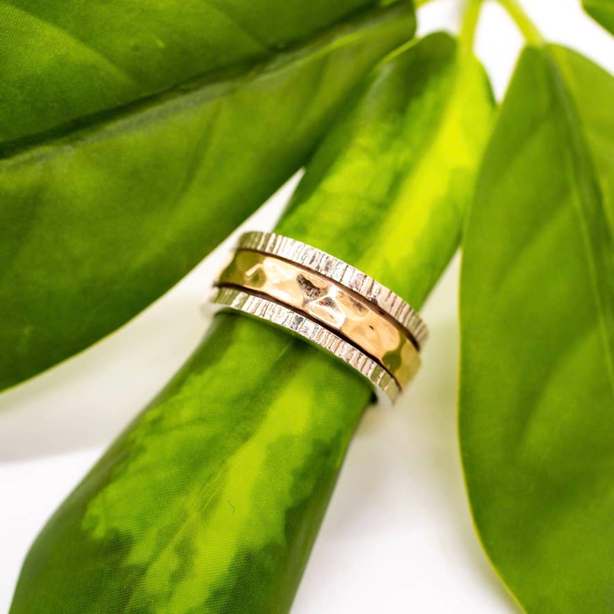 Sterling silver spinner ring with etching detail and thick hammered brass band. Available in sizes 6-12.