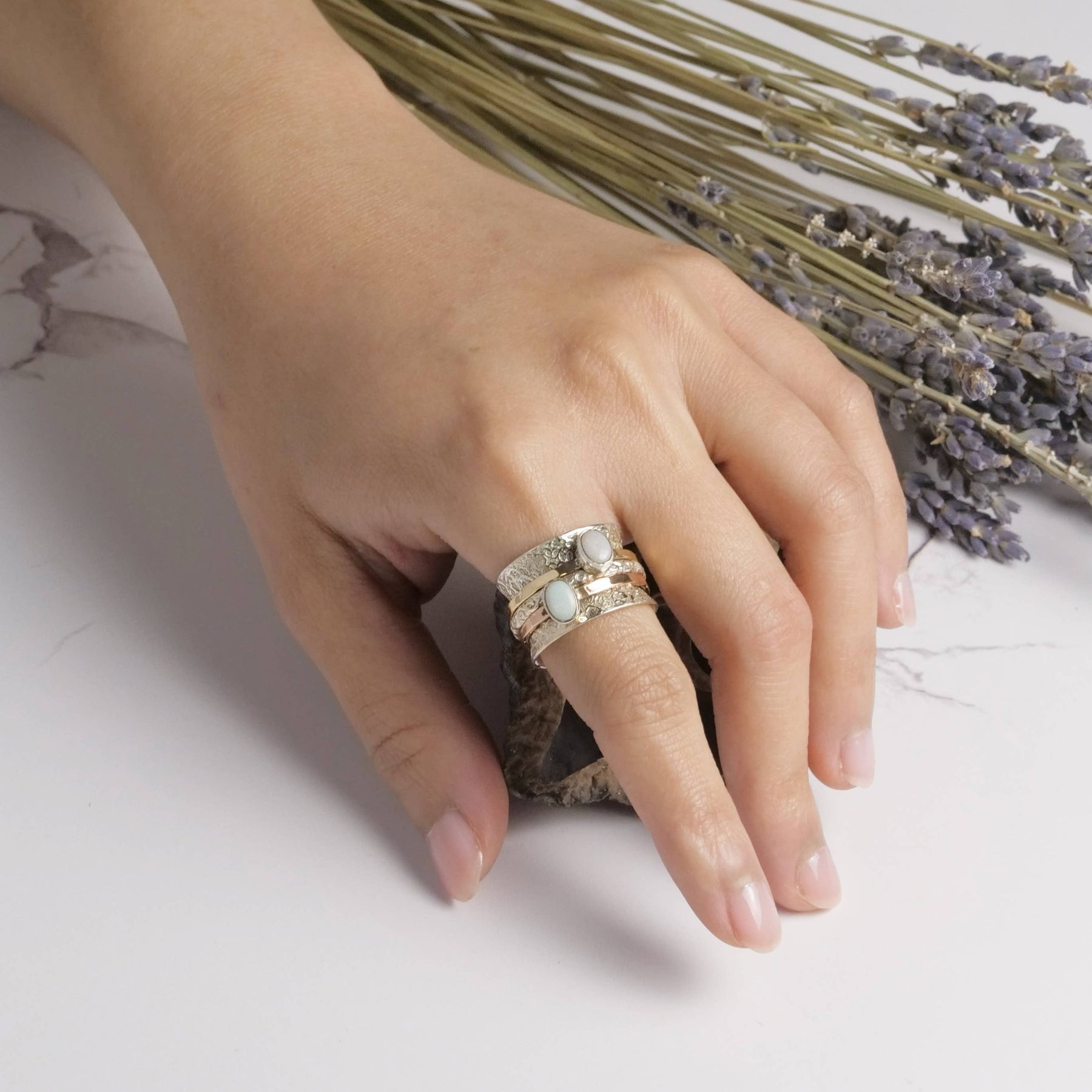 Our spinner rings are handmade with sterling silver and natural stones by silversmith artisans in Rajasthan, India. Inspired by the ancient prayer wheels of Tibet, you can spin the bands on your ring to reduce anxiety and support your own meditation practice.