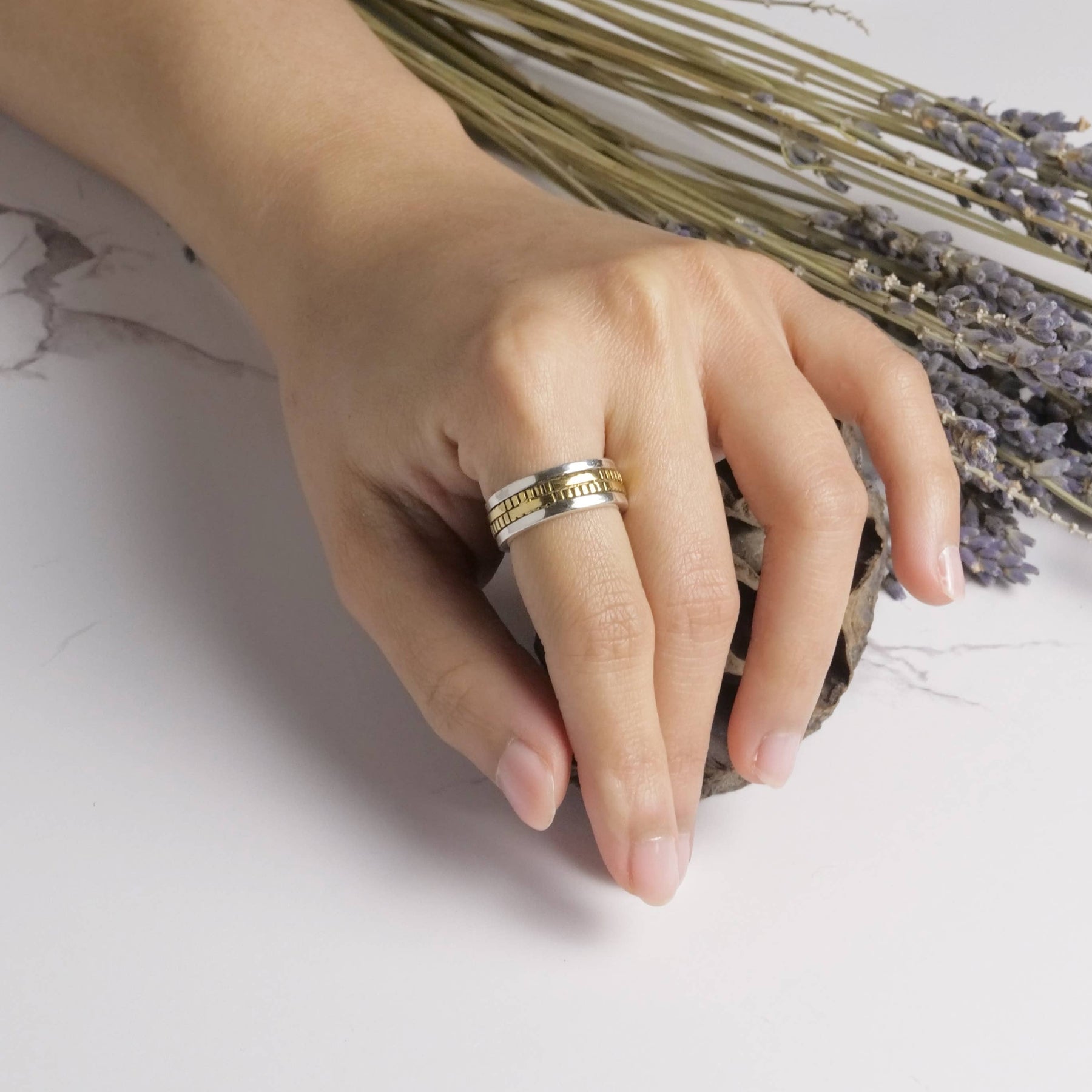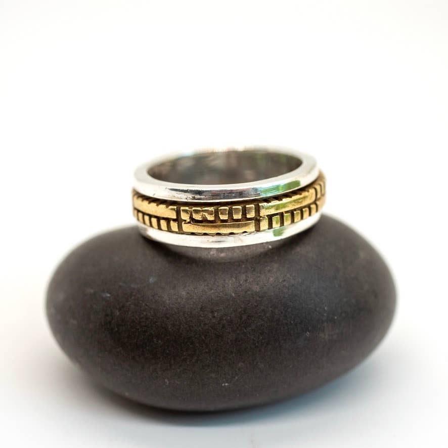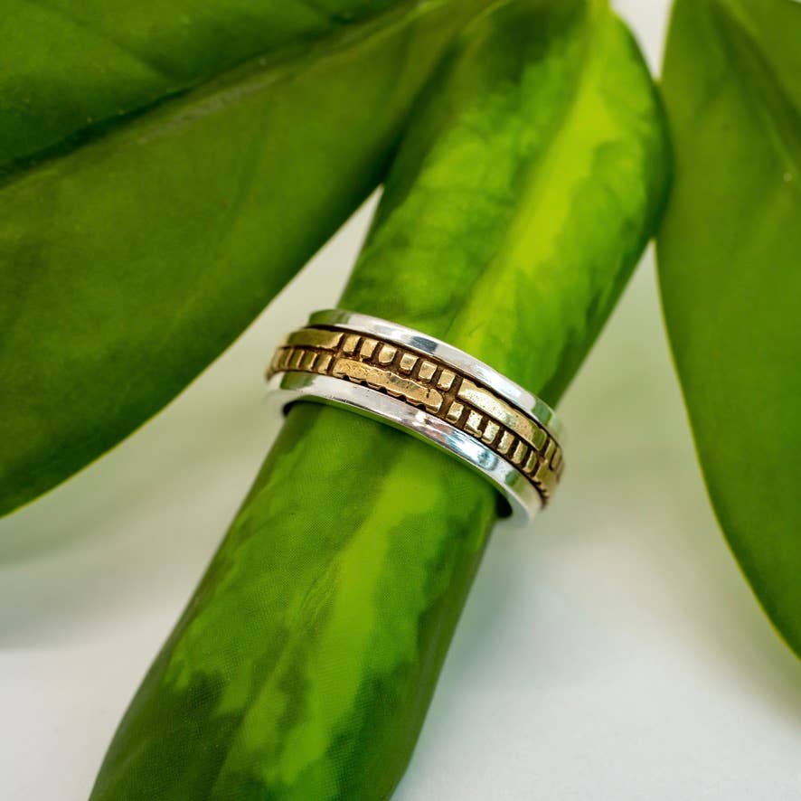 Sterling silver spinner ring with brass spinning band and bar and block design.