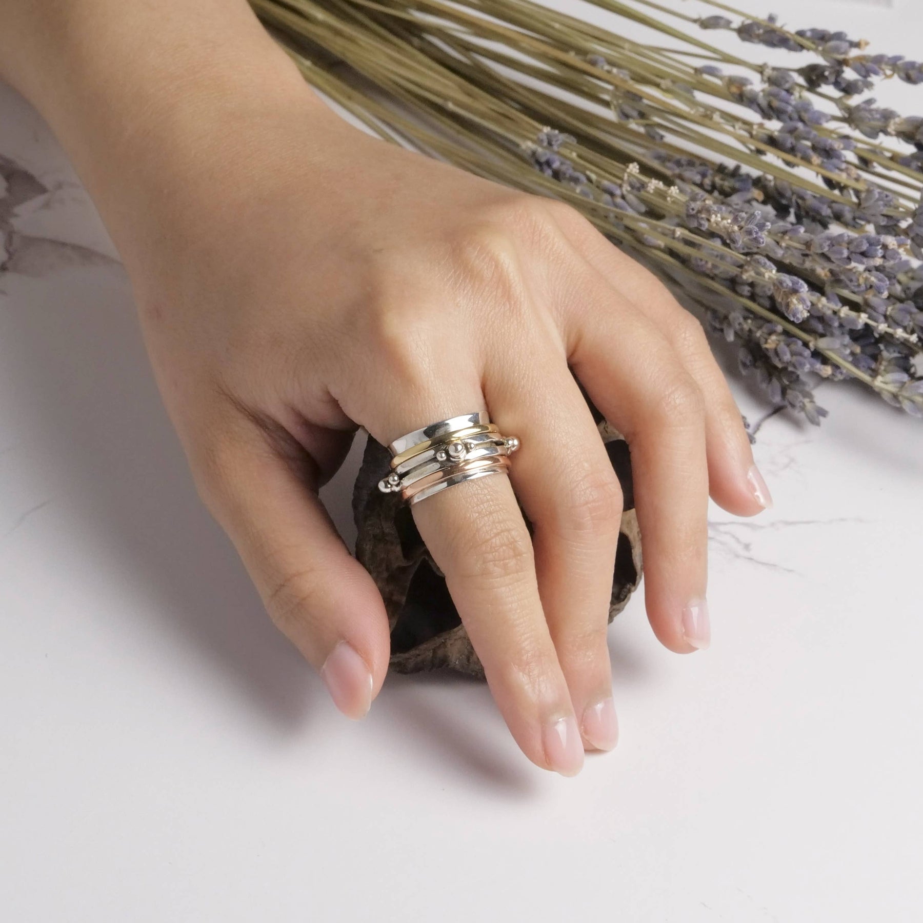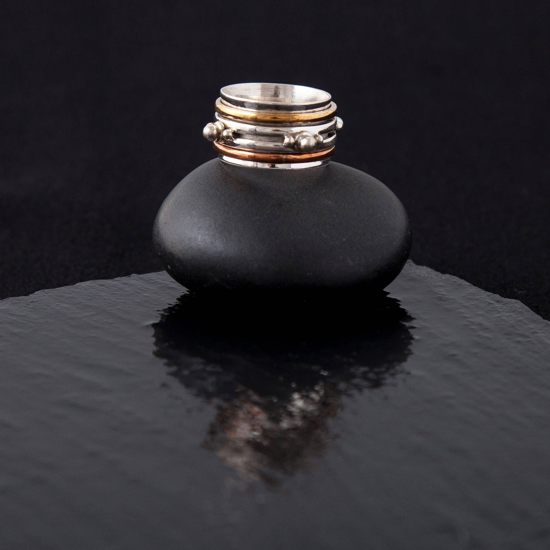 Sterling silver spinner ring with 4 knobs and mixed metal bands.