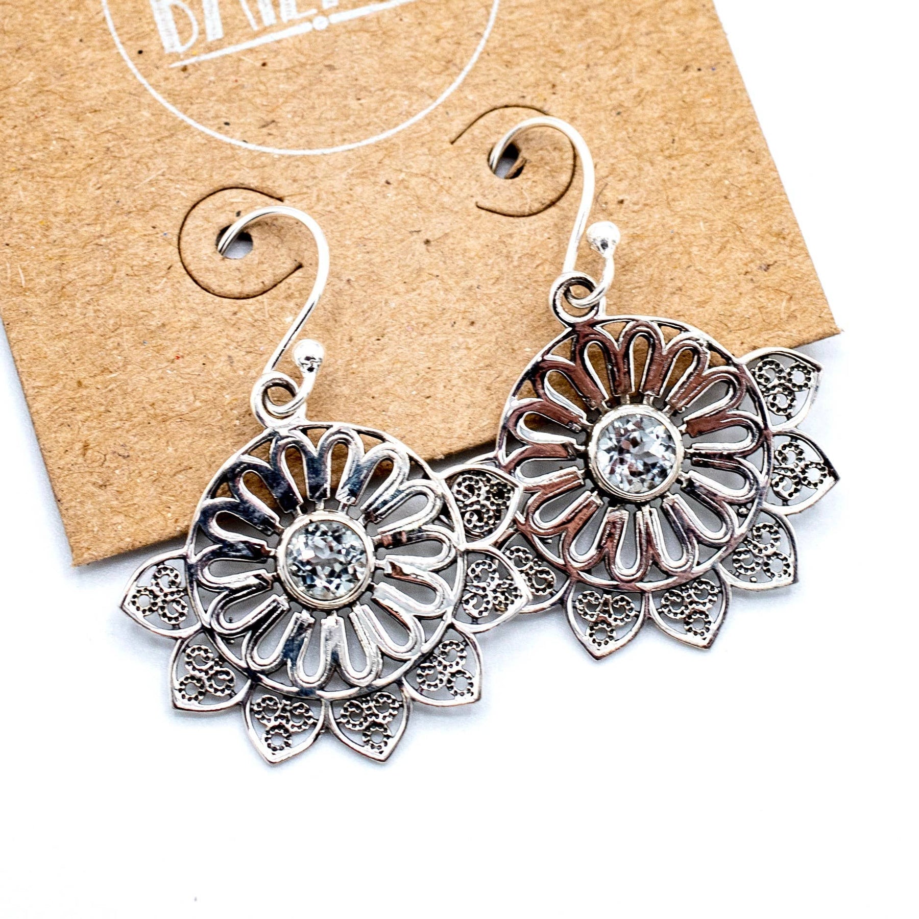 Sterling silver earring with gorgeous floral mandala design and faceted Blue Topaz stone. 1 inch by 1 inch.