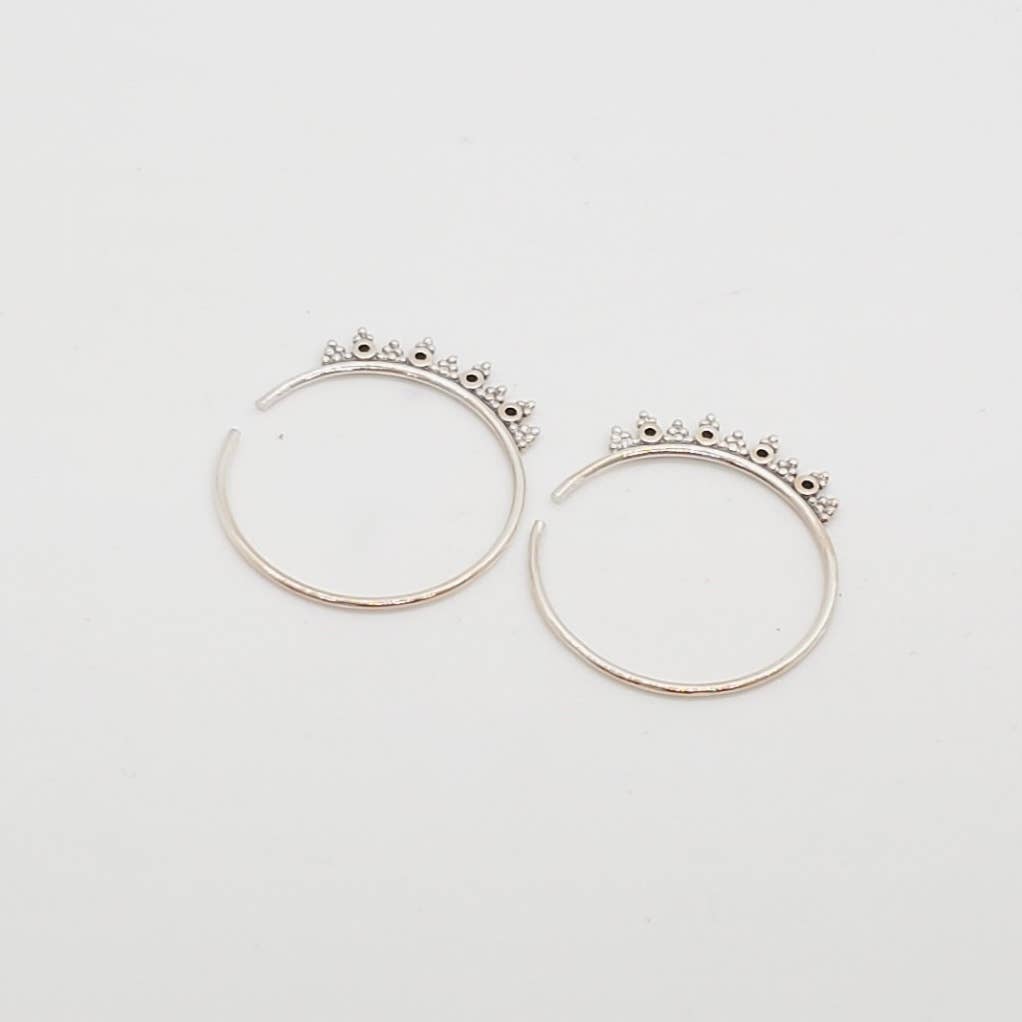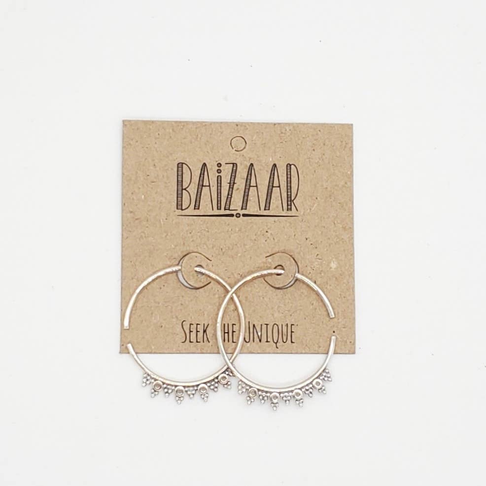 Experience the ethereal charm of Baizaar's Sterling Silver Decorated Hoop Earrings. Crafted from sterling silver, these hoops add a touch of elegance to any outfit. Perfect for a Christmas occasion, these earrings encapsulate the spirit of the season. We are proud to produce our products under fair trade practices and our packaging is fully recyclable. Enjoy the perfect blend of traditional and innovative design with Baizaar.