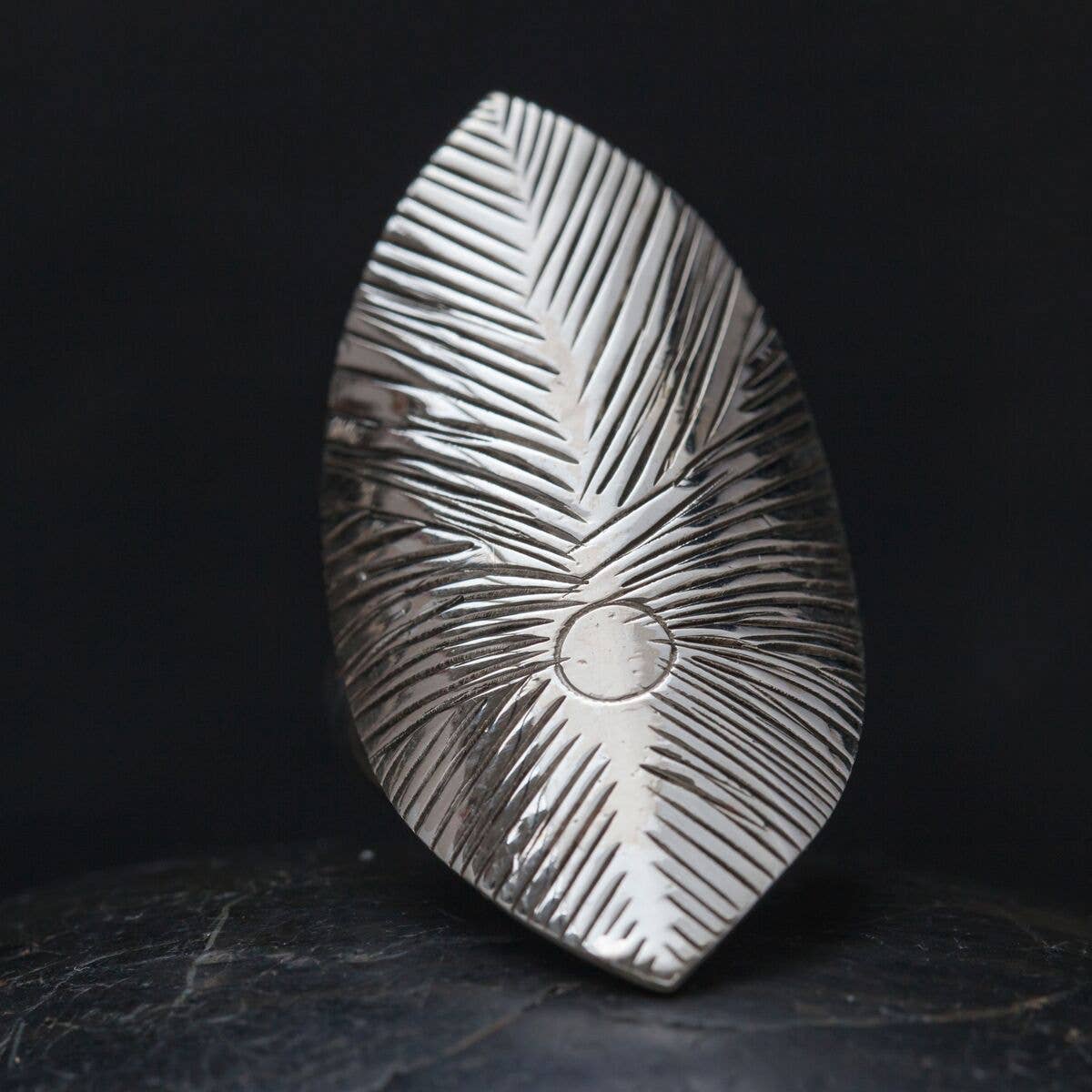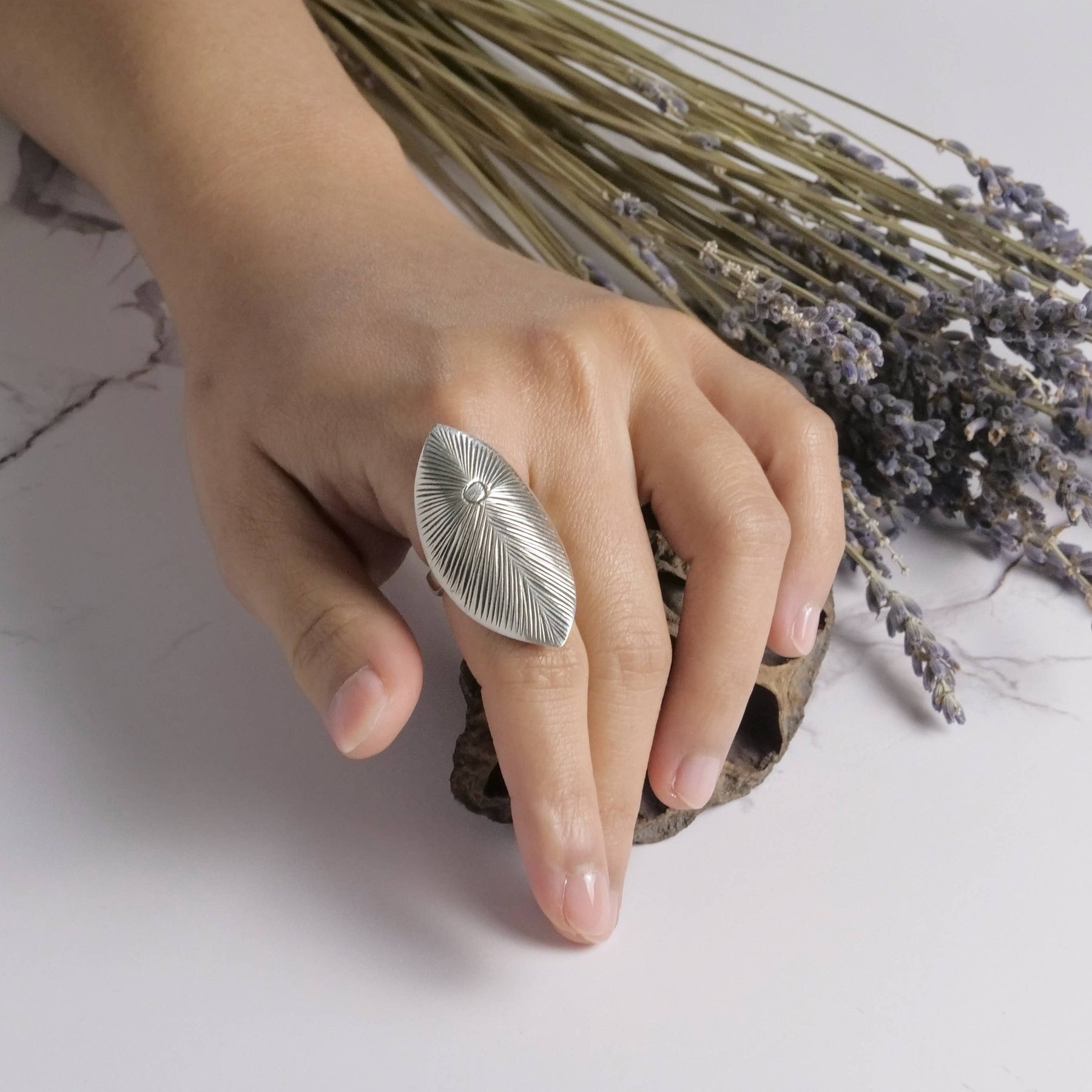 This enchanting Sterling Silver Etched Aura Ring exudes both elegance and mystery. The band is meticulously crafted from high-quality sterling silver, featuring intricate etchings that form a captivating, pattern. Each line and detail is carefully designed to create a sense of movement, as if the ring itself is imbued with a subtle, ethereal energy. This piece effortlessly blends vintage allure with modern sophistication, making it a perfect statement for those who seek both beauty and a touch of intrigue.