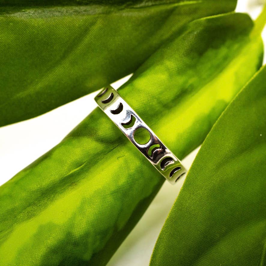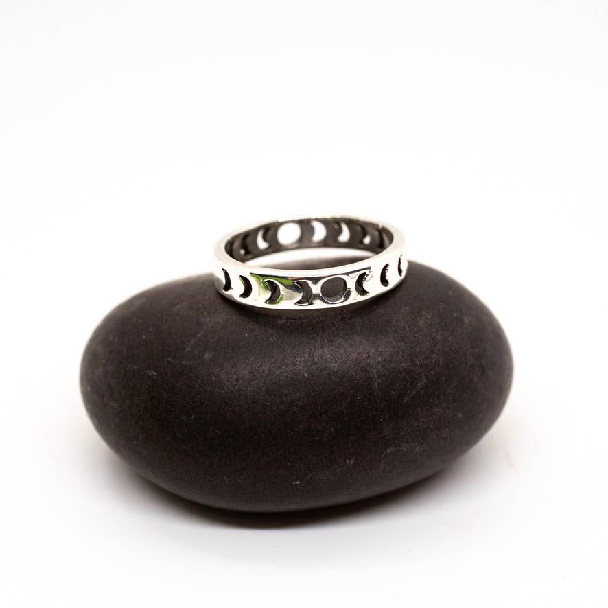 Sterling silver band ring featuring cutout moon phases, available in size 5-9.
