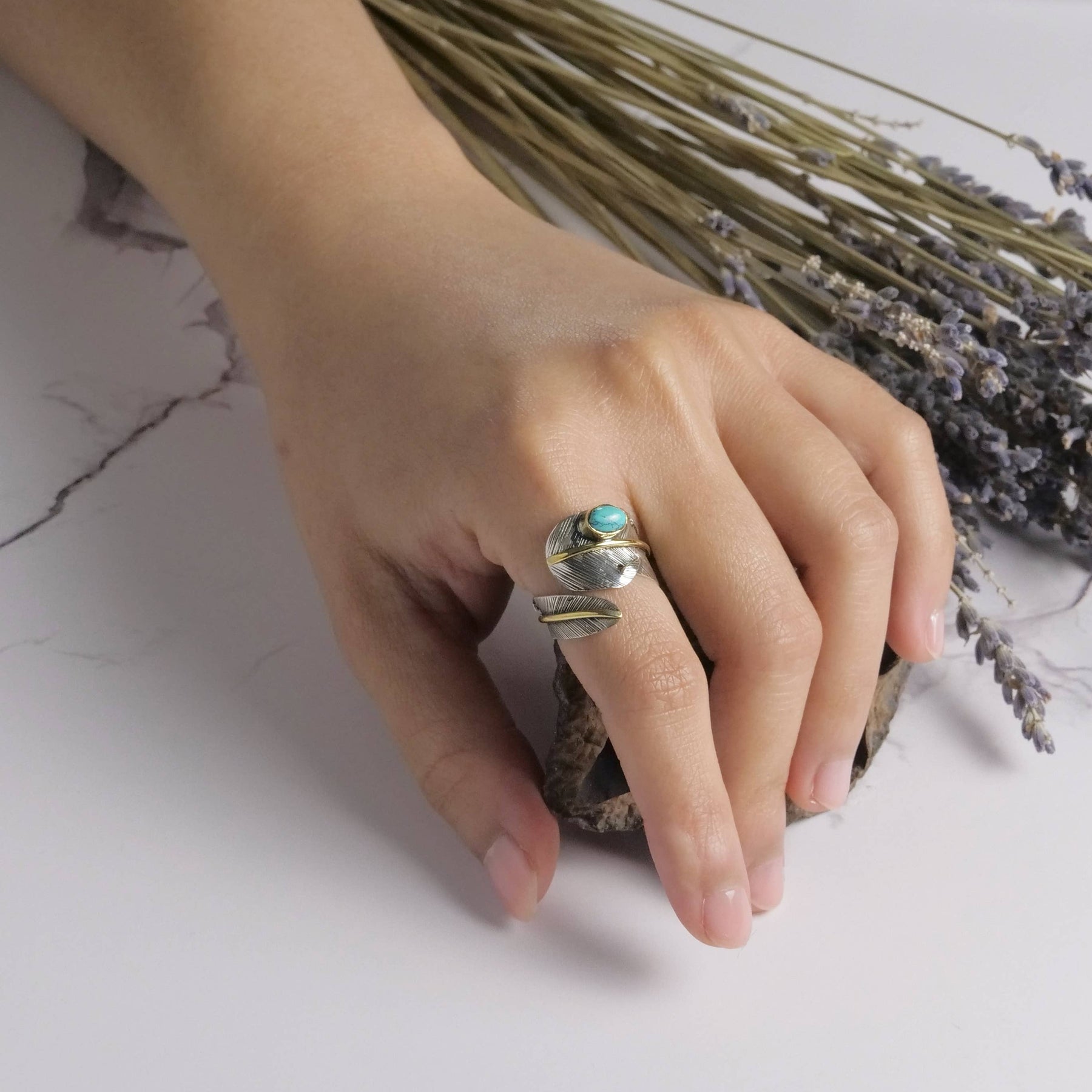 Adjustable wrapped feather design sterling silver ring with turquoise stone and brass detail.