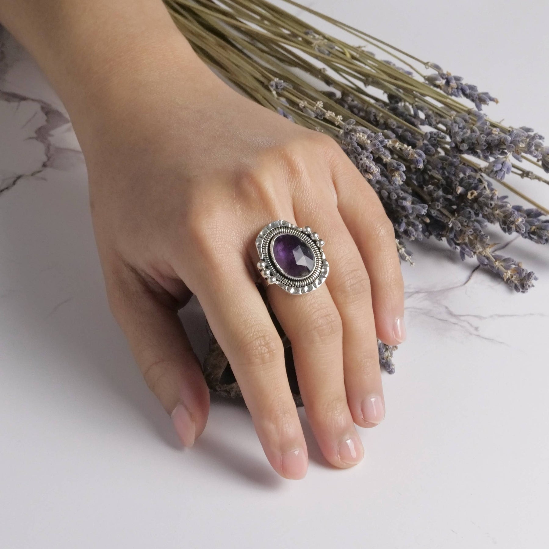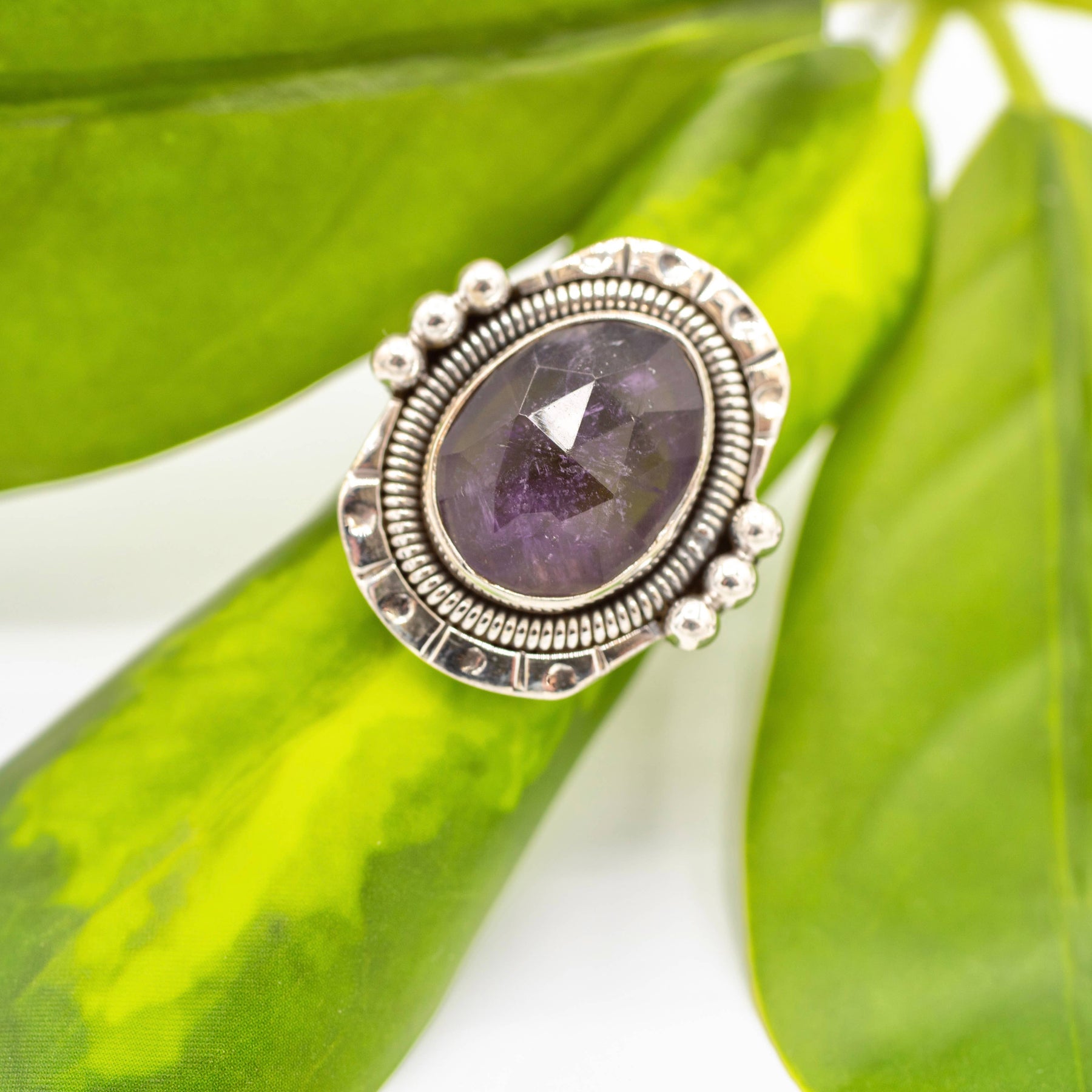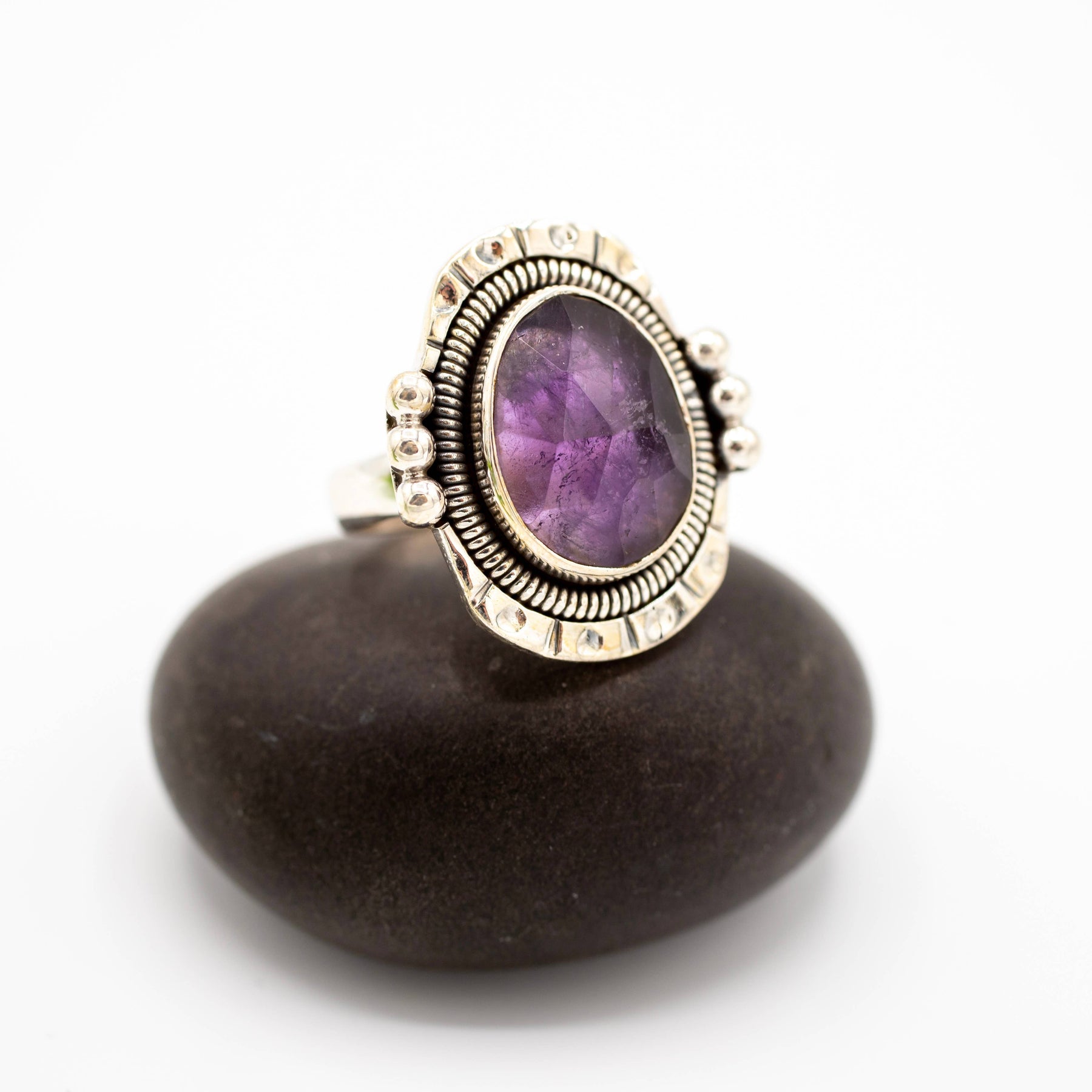 Sterling Silver Amethyst Goddess Ring, available in sizes 5-10.