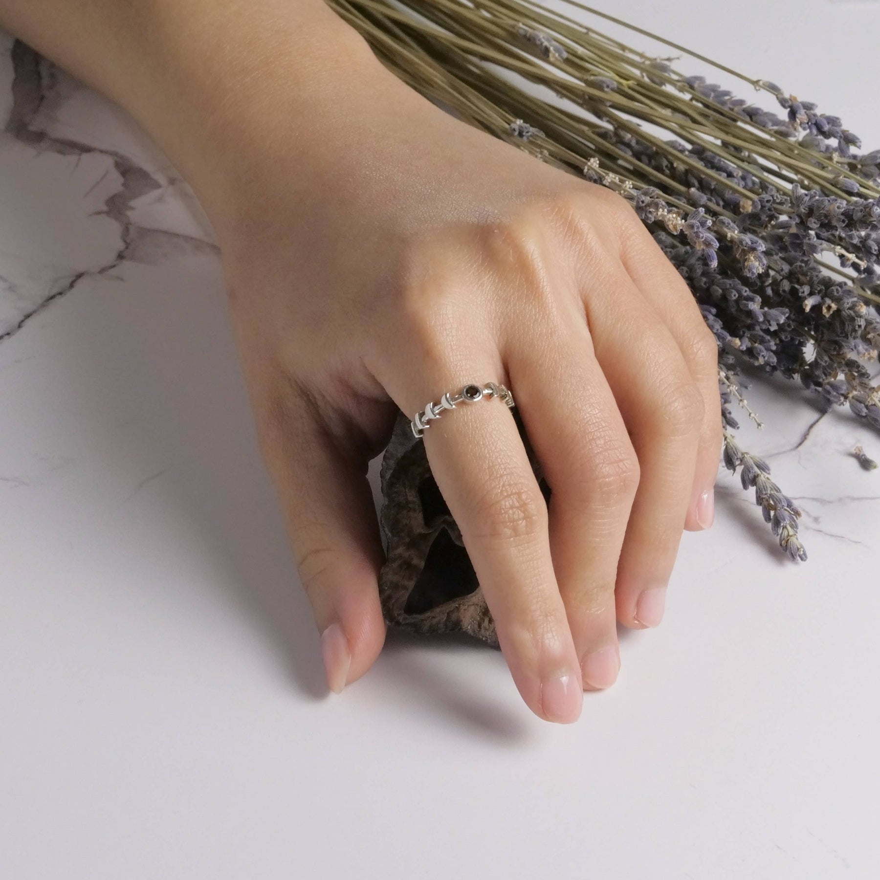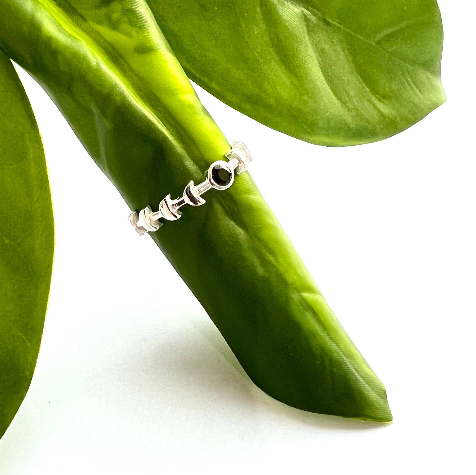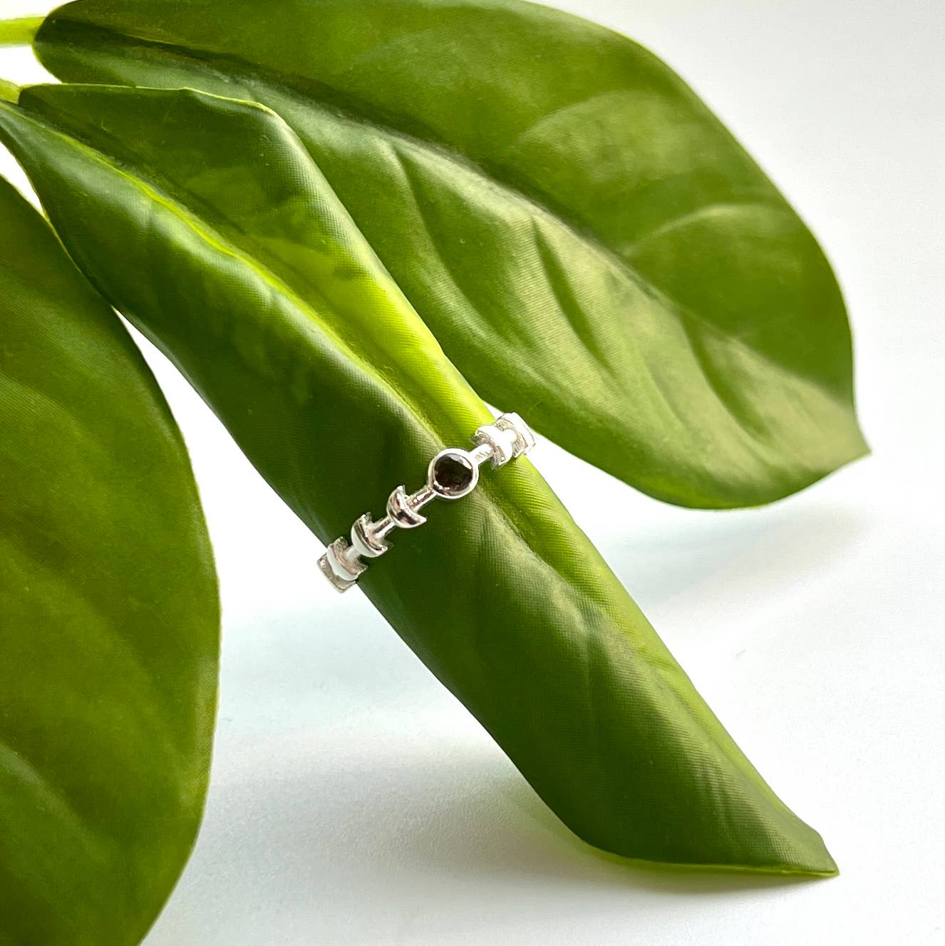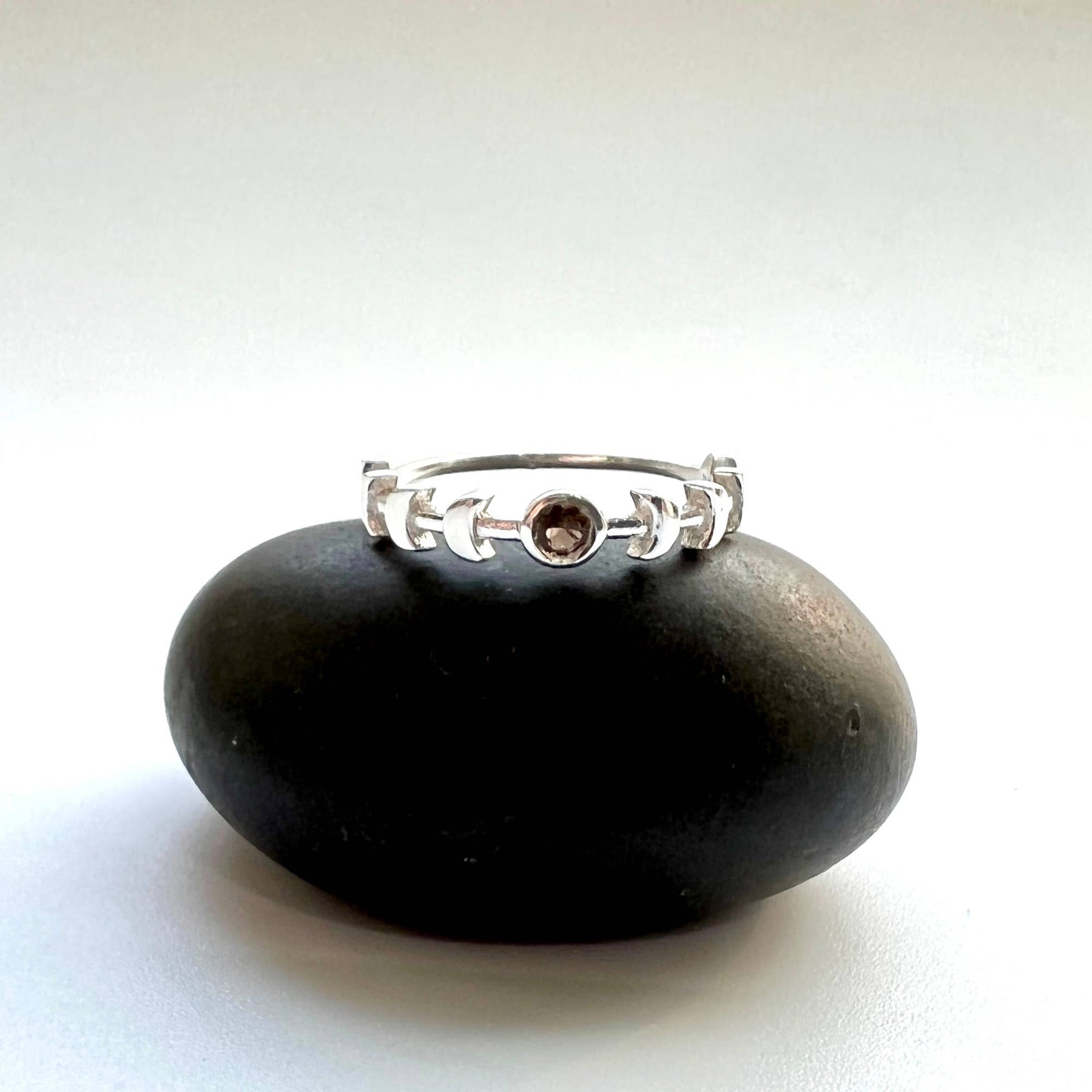 Sterling silver ring with crescent moon band and faceted smoky quartz.