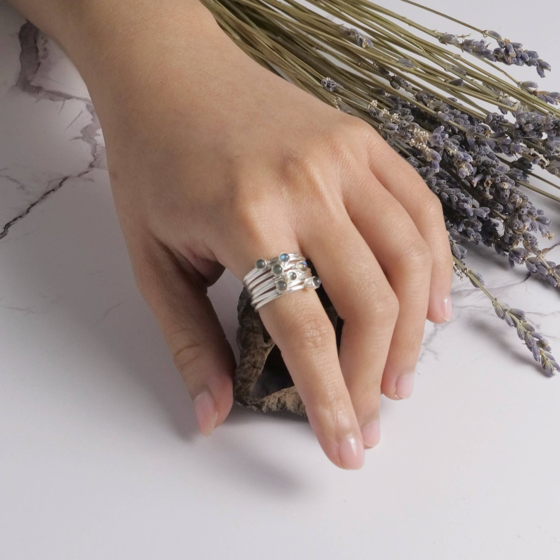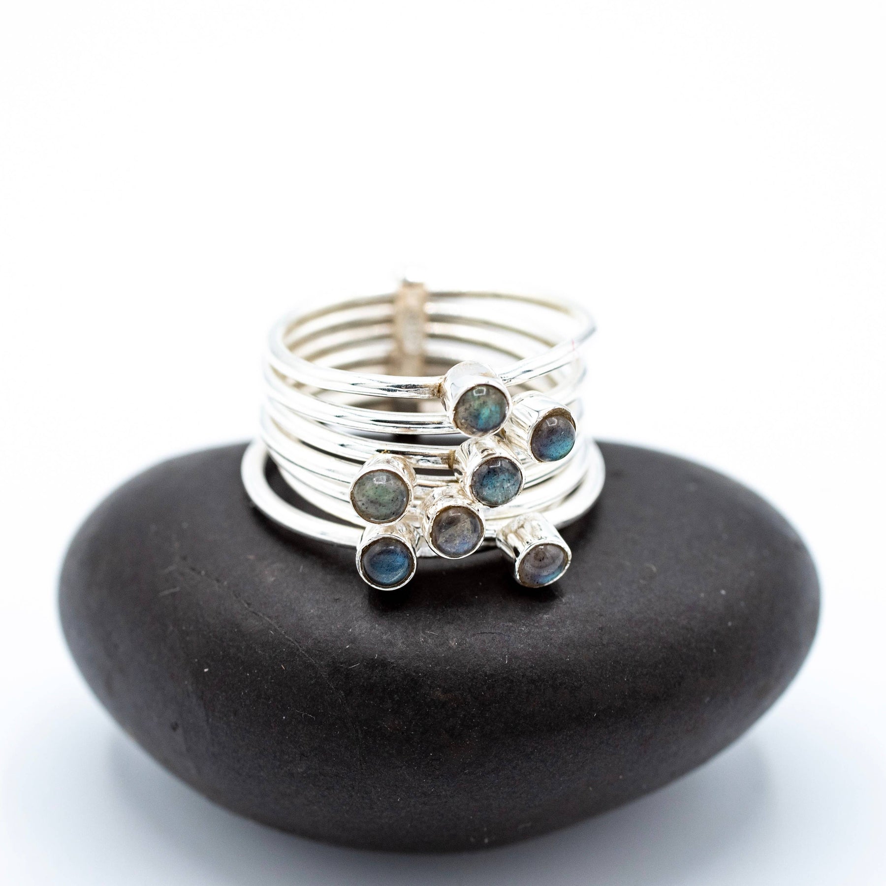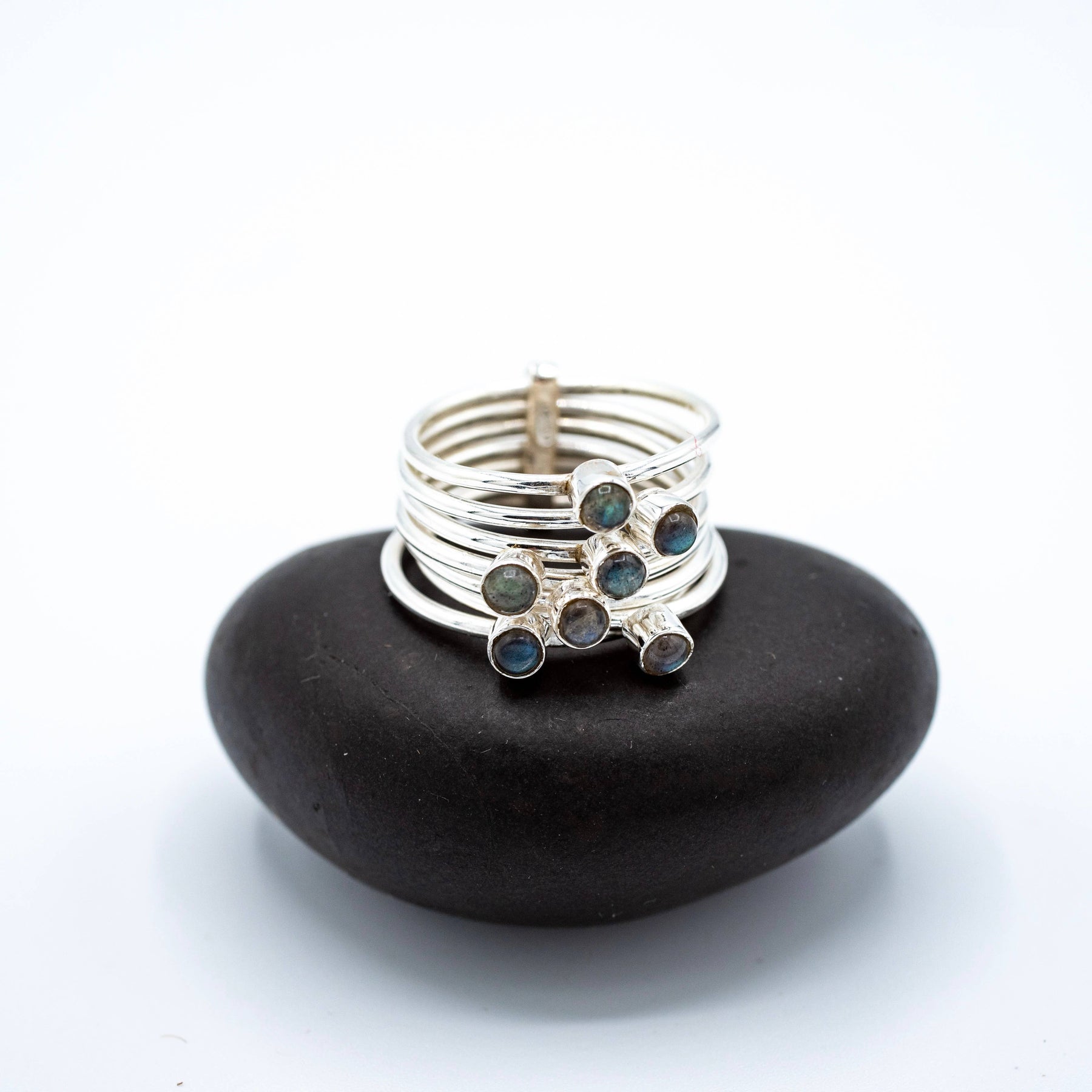 Sterling silver stacked stone band ring featuring 7 simple polished silver bands, each with a labradorite stone.