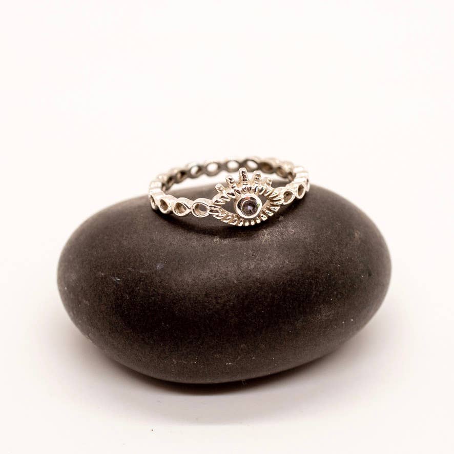 Sterling silver evil eye ring featuring faceted Iolite stone, available in size 5-10.