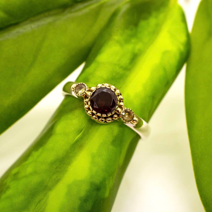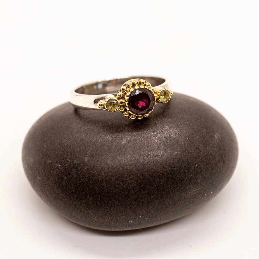 Sterling Silver ring with faceted garnet and peridot and brass detail, available in size 5-10.