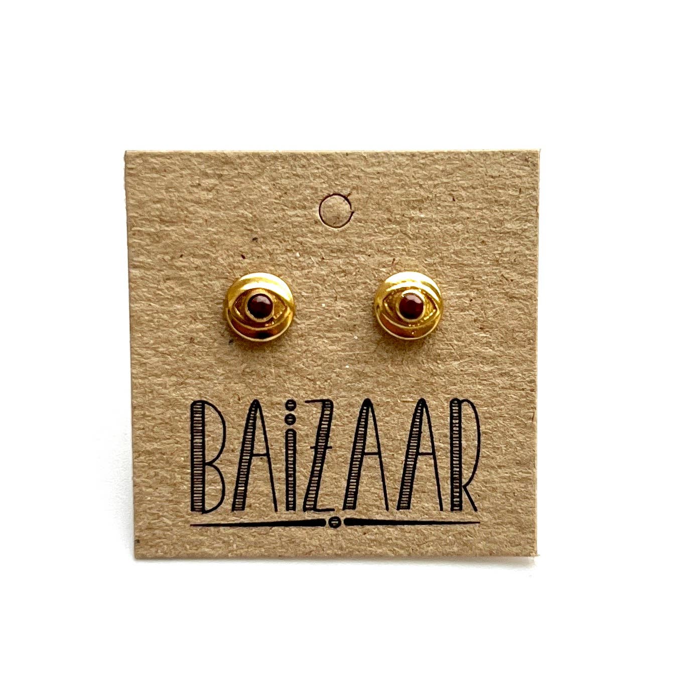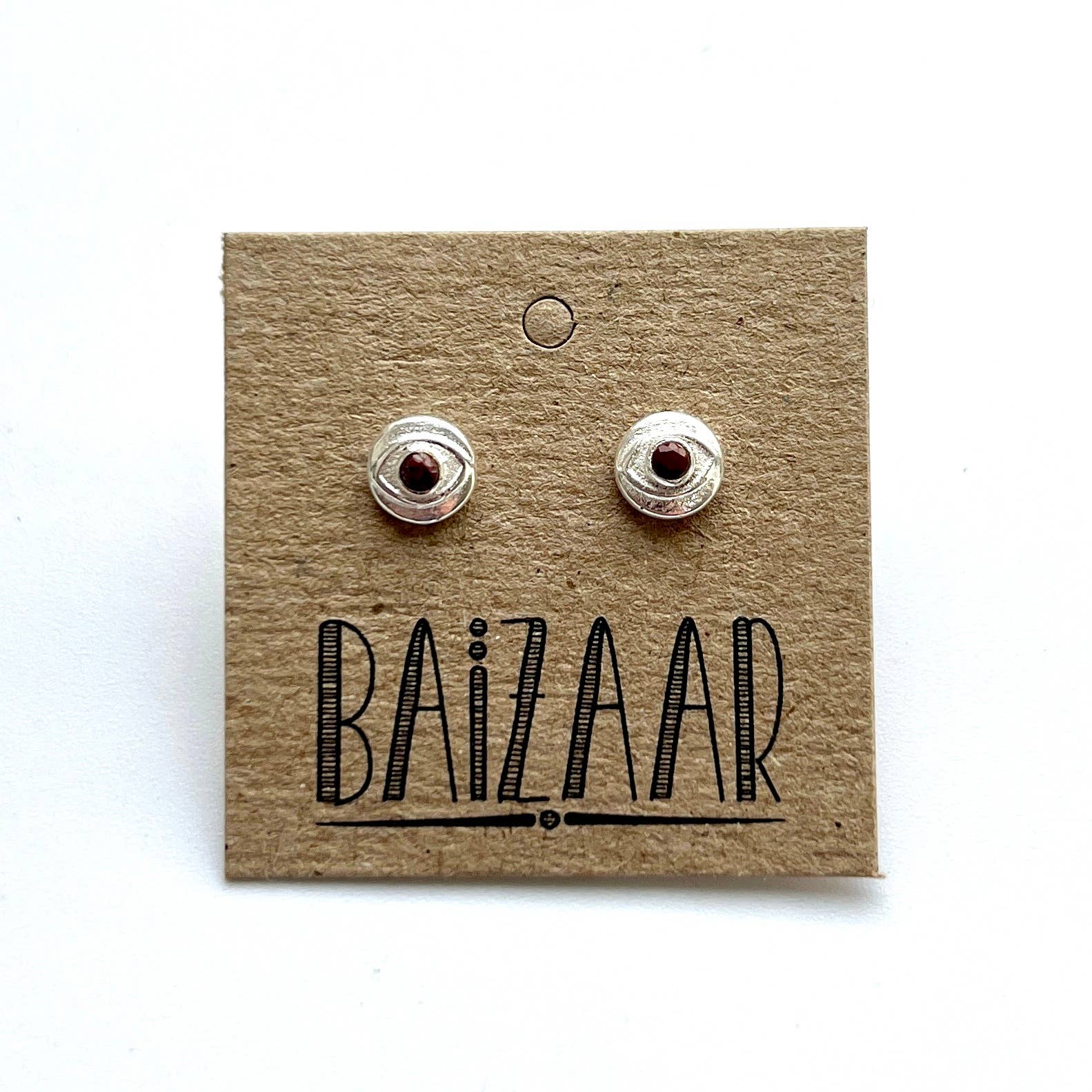 Decorated evil eye stud earrings with faceted ruby in sterling silver or brass.