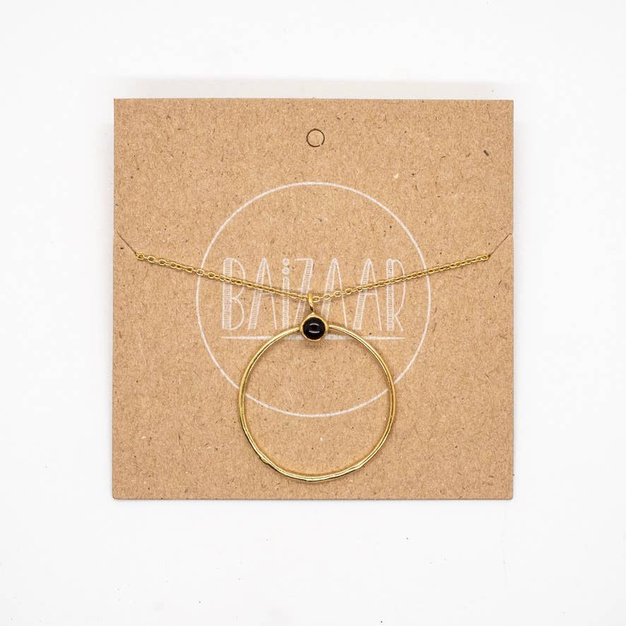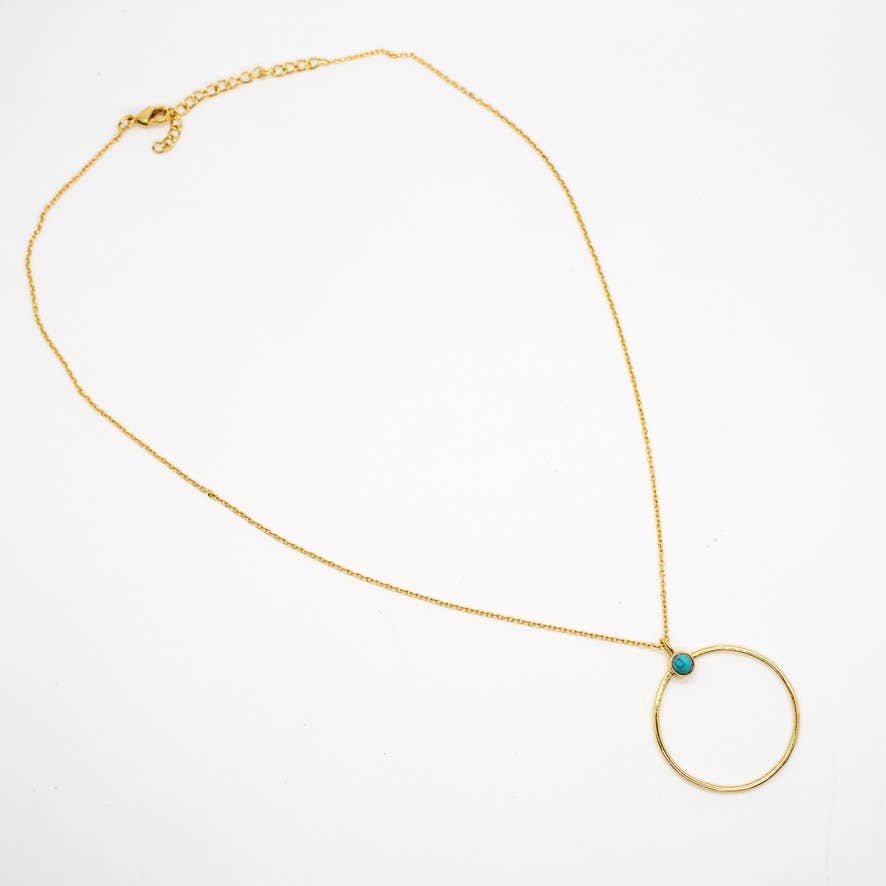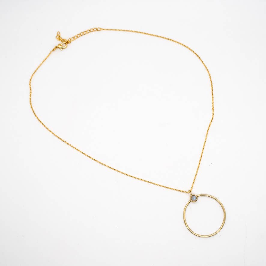 Brass necklace with hoop and stone design featuring Turquoise, Moonstone or Black Onyx stone. 15 inches long with 2 inch extender.