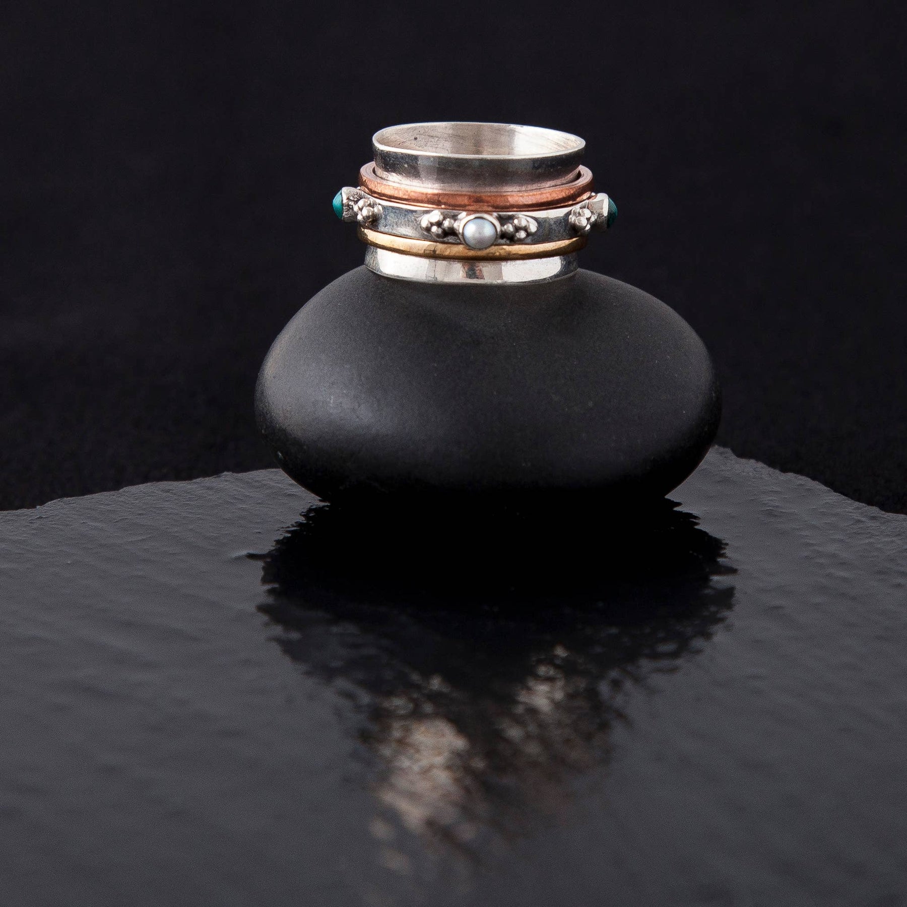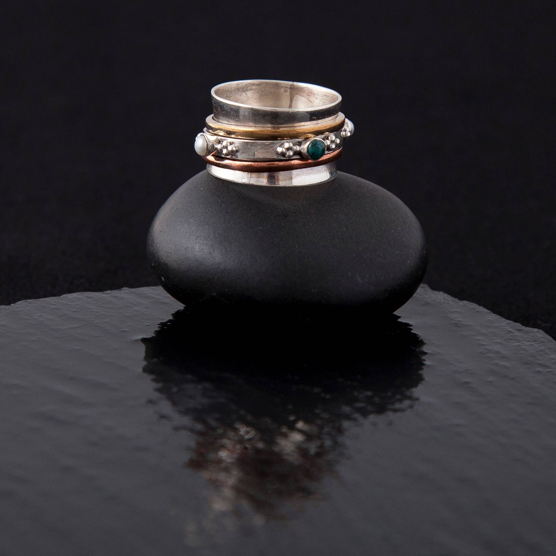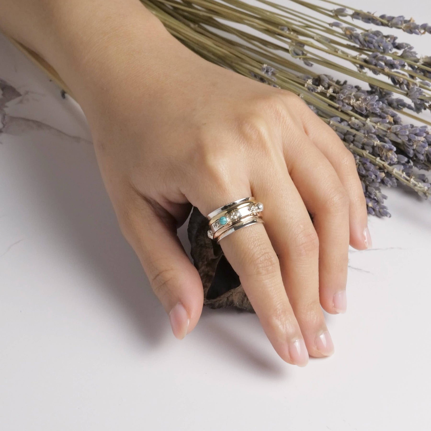 Our spinner rings are handmade with sterling silver and natural stones by silversmith artisans in Rajasthan, India. Inspired by the ancient prayer wheels of Tibet, you can spin the bands on your ring to reduce anxiety and support your own meditation practice.
