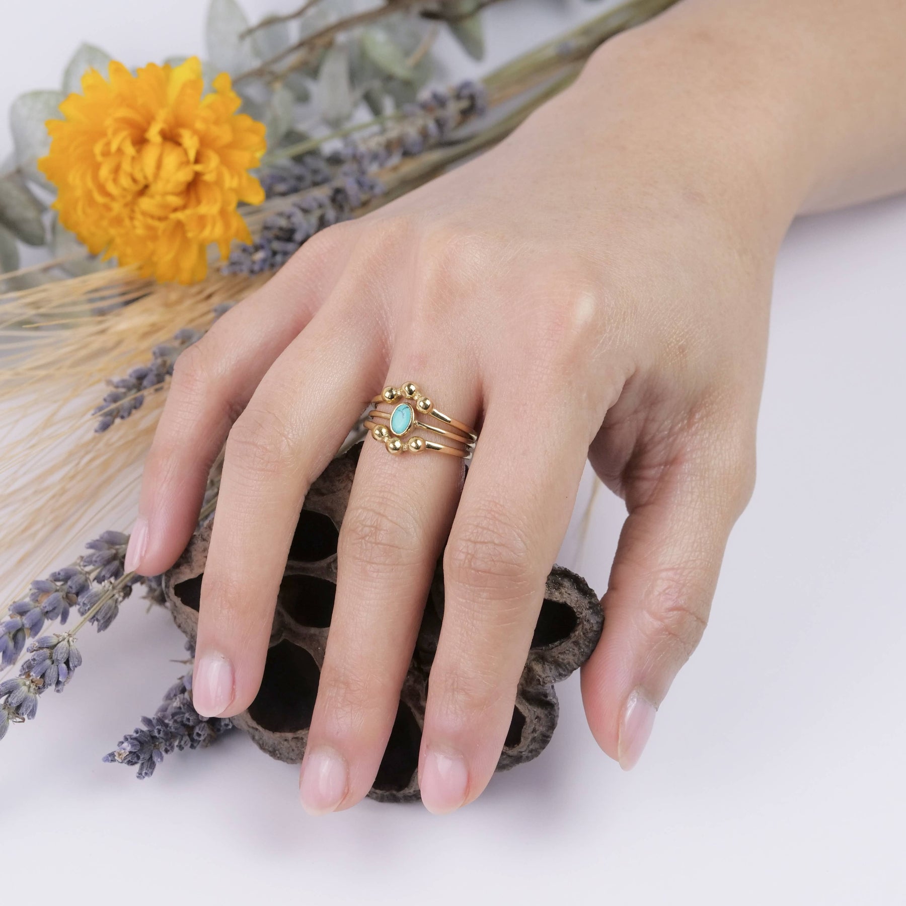 Brass stacker set featuring 3 bands that fit together: two spotted bands that hug either side of one simple band with a turquoise stone.